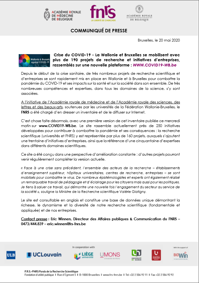 Communiqué de presse sur la crise du COVID-19 - La Wallonie et Bruxelles se mobilisent avec plus de 190 projets de recherche et initiatives d’entreprises, rassemblés sur une nouvelle plateforme : WWW.COVID19-WB.be.