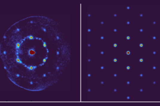 Photo : diffraction d’atomes d’hydrogène à travers une feuille de graphène d’un atome d’épaisseur : à gauche, l’image issue de l’expérience ; à droite, la prédiction théorique. Les motifs révèlent différentes orientations du réseau atomique du graphène (c) P. Guichard et al.