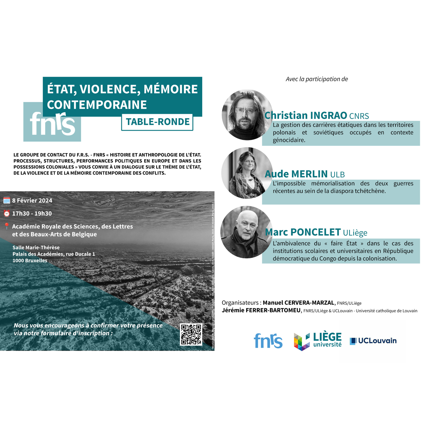 Le 8 février, le groupe de contact FNRS "Histoire & anthropologie de l'État" invite Christian Ingrao, Aude Merlin, Marc Poncelet et Marius Loris à participer à une table-ronde intitulée "État, violence et mémoire contemporaine". Cette table-ronde aura lieu à l'Académie royale des Sciences et des Beaux-Arts de Belgique.