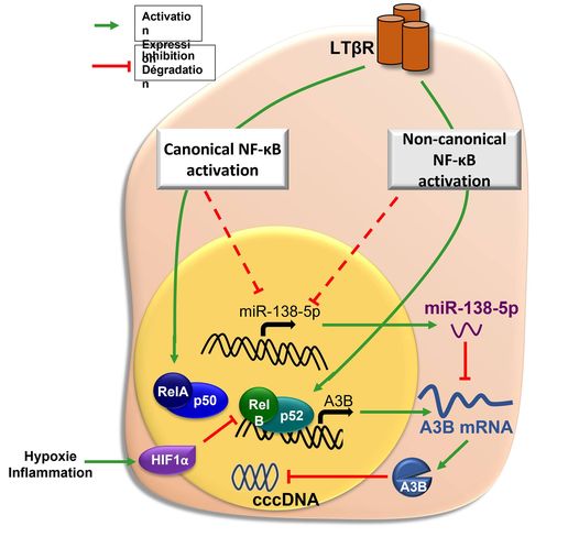 ? Les chercheurs ont mis en évidence de nouveaux mécanismes qui permettent de cibler plus efficacement la dégradation de l’ADNccc. En effet, l’activation du récepteur à la Lymphotoxine (LT[bêta]R) sur les hépatocytes infectés permet une expression accrue d’une protéine clé appelée APOBEC3B (A3B) qui modifie l’ADNccc et favorise sa dégradation.