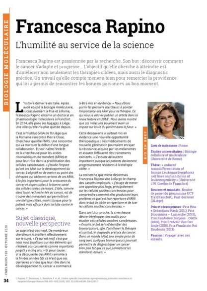 - Francesca Rapino, Chercheuse qualifiée FNRS en Pharmacie moléculaire, au Laboratoire Stem Cells - Cancer Signaling (GIGA Institute) de l' Université de Liège, dont les recherches visent à améliorer les thérapies ciblées et le diagnostic précoce des #cancers.