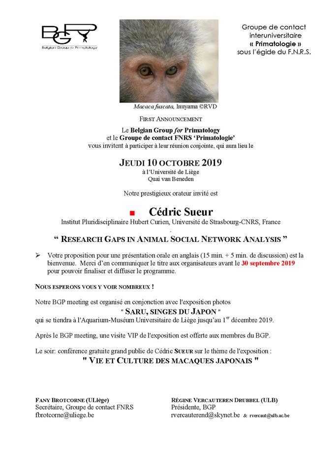 Rendez-vous avec Cédric Sueur dans le cadre de la réunion du Belgium Group for Primatology et du groupe FNRS Primatologie. Il y donnera deux séminaires. L'exposition SARU singes du Japon sera aussi présente à Aquarium-Muséum Liegi.