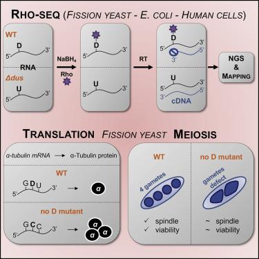 L'équipe namuroise en a étudié une en particulier, appelée D pour dihyrouridine (une modification du U) et ils ont découvert que sa présence sur des ARN dits messagers (ceux qui permettent de faire des protéines) ralentit le mécanisme de production de certaines protéines (la traduction), ce qui a un impact sur le cytosquelette de la cellule et la ségrégation des chromosomes.