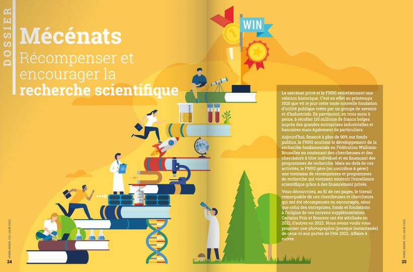 Le dossier spécial de 38 pages de ce numéro est consacré aux récompenses scientifiques gérées par le FNRS : qu'elles soient sous forme de Prix, Bourses ou Programmes de recherche ; qu'elles soient attribuées à un travail scientifique d'excellence au sens large ou dans un domaine très précis ; qu'elles soient destinées à récompenser une thèse ou le travail de tout une carrière.