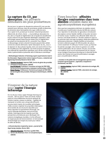 13%u2013 FNRS.NEWS 134-JUIN 2025Fines bouches%u00a0: affinit%u00e9s florales contrast%u00e9es chez trois abeilles utilis%u00e9es dans les agro%u00e9cosyst%u00e8mes europ%u00e9ensAlors que leurs populations d%u00e9clinent, les abeilles restent cruciales pour la pollinisation de plus de 80% des cultures. Pour r%u00e9pondre %u00e0 la demande, les agriculteurs introduisent des esp%u00e8ces comme l%u2019abeille mellif%u00e8re, le bourdon terrestre et l%u2019osmie rousse. Toutefois, leur efficacit%u00e9 r%u00e9elle reste mal connue. Une %u00e9tude men%u00e9e sur 128 sites cultiv%u00e9s en colza ou en pommier dans huit pays europ%u00e9ens r%u00e9v%u00e8le des pr%u00e9f%u00e9rences alimentaires distinctes. L%u2019abeille mellif%u00e8re et le bourdon terrestre collectent jusqu%u2019%u00e0 30%u201350% de pollen de culture, contre seulement 10%u201320% pour l%u2019osmie rousse, qui favorise les plantes sauvages. Cela remet en question son utilit%u00e9 comme pollinisateur de ces cultures. De plus, aucune des trois esp%u00e8ces ne se nourrit exclusivement de ces cultures, ce qui souligne l%u2019importance de pr%u00e9server la diversit%u00e9 florale autour des champs ainsi que les pollinisateurs sauvages pour%u00a0une%u00a0pollinisation efficace.%u00ab%u00a0Variation in the pollen diet of managed bee species across European agroecosystems%u00a0%u00bb, Agriculture, Ecosystems & Environment, mai 2025.Antoine Geki%u00e8re, Aspirant FNRS, Laboratoire de zoologie, IBS, UMONSCl%u00e9ment Tourbez, Aspirant FNRS, Laboratoire de zoologie, IBS, UMONSEt al.S%u2019inspirer de la nature pour capter l%u2019%u00e9nergie infrarouge Et si la cl%u00e9 pour mieux capter l%u2019%u00e9nergie thermique se trouvait%u2026 dans la nature ? Dans cet article, l%u2019auteur passe en revue diff%u00e9rentes structures optiques de certains insectes, oiseaux ou plantes %u2013%u00a0capables de manipuler la lumi%u00e8re avec une grande efficacit%u00e9%u00a0%u2013 qui pourraient inspirer de nouvelles technologies. L%u2019id%u00e9e consiste %u00e0 exploiter les propri%u00e9t%u00e9s d%u2019absorption de la lumi%u00e8re de ces structures naturelles pour mieux absorber le rayonnement infrarouge, une source d%u2019%u00e9nergie abondante, mais encore peu utilis%u00e9e. Cette approche bio-inspir%u00e9e ouvre des perspectives prometteuses pour d%u00e9velopper des solutions %u00e9nerg%u00e9tiques durables, %u00e0 la fois efficaces et%u00a0respectueuses de l%u2019environnement. Un bel exemple de technologie qui s%u2019inspire du vivant pour relever les%u00a0d%u00e9fis de demain.%u00ab%u00a0Infrared absorbers inspired by nature%u00a0%u00bb, Journal of the Royal Society Interface, f%u00e9vrier 2025.S%u00e9bastien Mouchet, Chercheur qualifi%u00e9 FNRS, Service des Mat%u00e9riaux micro- et nanophotoniques, UMONSLa capture du CO2 par absorption%u00a0: les solvants d%u00e9mixants les plus prometteurs De nos jours, la capture du dioxyde de carbone (CO2) est une des solutions pour diminuer, dans les prochaines ann%u00e9es et d%u00e9cennies, les %u00e9missions dans l%u2019atmosph%u00e8re de ce gaz %u00e0 effet de serre. Pour capter le CO2 produit par le secteur industriel (production d%u2019%u00e9lectricit%u00e9, de ciment, d%u2019acier %u2026), le proc%u00e9d%u00e9 par absorption du CO2 dans un liquide et r%u00e9g%u00e9n%u00e9ration de ce liquide est actuellement le plus mature et le plus largement d%u00e9velopp%u00e9. Cependant, cette technologie requiert beaucoup de chaleur pour la r%u00e9g%u00e9n%u00e9ration du solvant et la production de CO2 concentr%u00e9. Pour r%u00e9duire ce%u00a0d%u00e9savantage, certains solvants innovants peuvent %u00eatre utilis%u00e9s comme les solvants d%u00e9mixants. Apr%u00e8s l%u2019absorption du CO2, ceux-ci se s%u00e9parent en deux phases liquides, dont une seule (riche en CO2) est chauff%u00e9e pour %u00eatre r%u00e9g%u00e9n%u00e9r%u00e9e. Cet article propose et applique une m%u00e9thode de classification sp%u00e9cifique, pour de tels solvants d%u00e9j%u00e0 test%u00e9s %u00e0 petite %u00e9chelle et pr%u00e9sent%u00e9s dans la litt%u00e9rature scientifique.%u00ab%u00a0Methodological Selection of Demixing Liquid%u2212Liquid Solvents Used in the Absorption%u2212Regeneration Carbon Capture Process%u00a0%u00bb, Industrial and Engineering Chemistry Research, f%u00e9vrier 2025.*Damien Verdonck, Aspirant FNRS, Service de g%u00e9nie des proc%u00e9d%u00e9s chimiques et biochimiques, UMONSGuy De Weireld, Professeur, Promoteur principal de PDR FNRS, Service de thermodynamique et physique math%u00e9matique, UMONSDiane Thomas, Professeure, Promotrice principale de PDR FNRS, Service de g%u00e9nie des proc%u00e9d%u00e9s chimiques et biochimiques, UMONSEt al.%u00a9 iStock