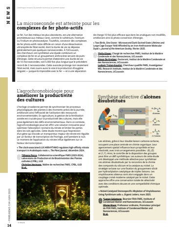 14%u2013 FNRS.NEWS 134-JUIN 2025Les alc%u00e8nes, gr%u00e2ce %u00e0 leur double liaison carbone-carbone, occupent une place centrale en chimie organique. Leur agencement spatial influence leurs propri%u00e9t%u00e9s et leur r%u00e9activit%u00e9, avec trois arrangements possibles%u00a0: (E), (Z) et (1,1%u2019). Ainsi, le contr%u00f4le de la disposition des groupes peut %u00eatre un d%u00e9fi synth%u00e9tique. Les auteurs de cette %u00e9tude ont d%u00e9velopp%u00e9 une m%u00e9thode s%u00e9lective pour synth%u00e9tiser ces alc%u00e8nes disubstitu%u00e9s par la rencontre de la chimie des compos%u00e9s du silicium et la catalyse au nickel. La strat%u00e9gie se base sur une fixation du groupement silici%u00e9 par hydrosilylation catalytique de triples liaisons. Les vinylsiloxanes obtenus sont alors engag%u00e9s dans un couplage crois%u00e9 moderne catalys%u00e9 par le nickel. Cette approche offre une conservation totale de%u00a0s%u00e9lectivit%u00e9 avec des conditions douces et une compatibilit%u00e9 chimique optimale.%u00ab%u00a0Nickel-Catalyzed Stereospecific Alkylation of Vinylsiloxanes Using Pyridinium salts%u00a0%u00bb, Organic Letters, mars 2025. *Logan Salamone, Boursier FRIA FNRS, Institute of Condensed Matter and Nanosciences, UCLouvainOlivier Riant, Professeur ordinaire, Promoteur principal de PDR FNRS, Institute of Condensed Matter and Nanosciences, UCLouvainEt al.L%u2019agrochronobiologie pour am%u00e9liorer la productivit%u00e9 des%u00a0culturesL%u2019horloge circadienne permet de synchroniser les processus physiologiques des plantes %u00e0 des moments pr%u00e9cis de la journ%u00e9e, am%u00e9liorant ainsi l%u2019efficacit%u00e9 de l%u2019utilisation des ressources environnementales. En agriculture, la gestion de la fertilisation azot%u00e9e est cruciale pour la productivit%u00e9 des cultures, mais elle pose %u00e9galement des d%u00e9fis environnementaux. Dans ce contexte, l%u2019agrochronobiologie pourrait offrir une solution innovante pour optimiser l%u2019absorption racinaire du nitrate et limiter les pertes dans%u00a0les sols agricoles. Cette %u00e9tude montre que l%u2019expression d%u2019un%u00a0g%u00e8ne qui encode un transporteur majeur de nitrate est r%u00e9gul%u00e9e par un facteur de transcription de l%u2019horloge, actif pendant la nuit. Le%u00a0moment de l%u2019application du nitrate influe %u00e9galement sur ce facteur de transcription.%u00ab%u00a0The clock-associated LUX ARRHYTHMO regulates high-affinity nitrate transport in Arabidopsis roots%u00a0%u00bb, The Plant Journal, d%u00e9cembre 2024.*Silvana Porco, Collaboratrice scientifique FNRS (2023-2024), Laboratoire de Production et de Biostimulation des Plantes cultiv%u00e9es (CPBL), ULBChristian Hermans, Ma%u00eetre de recherches FNRS, CPBL, ULBEt al. La microseconde est atteinte pour lescomplexes de fer photo-actifsLe fer, l%u2019un des m%u00e9taux les plus abondants, est une alternative prometteuse aux m%u00e9taux rares, comme le ruth%u00e9nium, l%u2019osmium ou l%u2019iridium en photocatalyse. Toutefois, concevoir des complexes de fer photo-actifs reste difficile en raison d%u2019une d%u00e9sactivation ultrarapide de l%u2019%u00e9tat excit%u00e9, dont la dur%u00e9e de vie ne d%u00e9passe g%u00e9n%u00e9ralement pas quelques nanosecondes. %u00c0 l%u2019UCLouvain, des%u00a0chercheurs ont synth%u00e9tis%u00e9 une dyade combinant un complexe de fer et un groupement anthrac%u00e8ne servant de puits d%u2019%u00e9nergie. Cette structure permet d%u2019atteindre une dur%u00e9e de vie de%u00a010%u00a0microsecondes, soit 5.000 fois plus longue que le pr%u00e9c%u00e9dent record de 2%u00a0nanosecondes. Cette avanc%u00e9e prolonge non seulement l%u2019%u00e9tat excit%u00e9, mais ouvre aussi la voie %u00e0 la production d%u2019oxyg%u00e8ne singulet %u2014 jusque-l%u00e0 impossible avec le fer %u2014 et %u00e0 une s%u00e9paration de%u00a0charge 10%u00a0fois plus efficace que dans les analogues non modifi%u00e9s, am%u00e9liorant ainsi la photo-conversion d%u2019%u00e9nergie.%u00ab%u00a0Two Birds, One Stone%u00a0: Microsecond Dark Excited-State Lifetime and Large Cage Escape Yield Afforded by an Iron%u2013Anthracene Molecular Dyad%u00a0%u00bb, Journal of the American Society, f%u00e9vrier 2025.*Felix Glaser, Charg%u00e9 de recherches FNRS, Institut de la Mati%u00e8re Condens%u00e9e et des Nanosciences, UCLouvainSimon De Kreijger, Doctorant, Institut de la Mati%u00e8re Condens%u00e9e et des Nanosciences, UCLouvainLudovic Troian-Gautier, Chercheur qualifi%u00e9 FNRS, Investigateur WEL Research Institute, Institut de la Mati%u00e8re Condens%u00e9e et des Nanosciences, UCLouvainNEWSL%u2019ast%u00e9risque renvoie %u00e0 la premi%u00e8re autrice ou au premier auteur.Synth%u00e8se s%u00e9lective d%u2019alc%u00e8nes disubstitu%u00e9s%u00a9 iStock