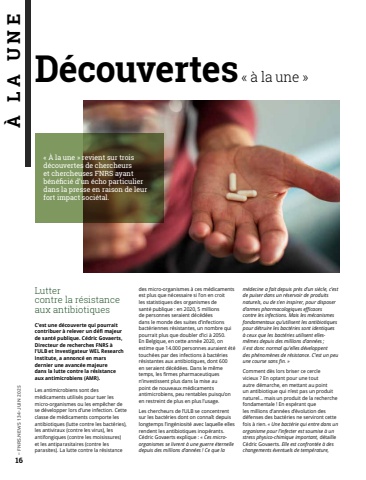 16%u2013 FNRS.NEWS 134-JUIN 2025Lutter contre la%u00a0r%u00e9sistance aux%u00a0antibiotiquesC%u2019est une d%u00e9couverte qui pourrait contribuer %u00e0 relever un d%u00e9fi majeur de sant%u00e9 publique. C%u00e9dric Govaerts, Directeur de recherches FNRS %u00e0 l%u2019ULB et Investigateur WEL Research Institute, a annonc%u00e9 en mars dernier une avanc%u00e9e majeure dans%u00a0la lutte contre la r%u00e9sistance aux%u00a0antimicrobiens (AMR). Les antimicrobiens sont des m%u00e9dicaments utilis%u00e9s pour tuer les micro-organismes ou les emp%u00eacher de se d%u00e9velopper lors d%u2019une infection. Cette classe de m%u00e9dicaments comporte les antibiotiques (lutte contre les bact%u00e9ries), les antiviraux (contre les virus), les antifongiques (contre les moisissures) et les antiparasitaires (contre les parasites). La lutte contre la r%u00e9sistance des micro-organismes %u00e0 ces m%u00e9dicaments est plus que n%u00e9cessaire si l%u2019on en croit les statistiques des organismes de sant%u00e9 publique%u00a0: en 2020, 5%u00a0millions de personnes seraient d%u00e9c%u00e9d%u00e9es dans le monde des suites d%u2019infections bact%u00e9riennes r%u00e9sistantes, un nombre qui pourrait plus que doubler d%u2019ici %u00e0 2050. En Belgique, en cette ann%u00e9e 2020, on estime que 14.000 personnes auraient %u00e9t%u00e9 touch%u00e9es par des infections %u00e0 bact%u00e9ries r%u00e9sistantes aux antibiotiques, dont 600 en seraient d%u00e9c%u00e9d%u00e9es. Dans le m%u00eame temps, les firmes pharmaceutiques n%u2019investissent plus dans la mise au point de nouveaux m%u00e9dicaments antimicrobiens, peu rentables puisqu%u2019on en restreint de plus en plus l%u2019usage.Les chercheurs de l%u2019ULB se concentrent sur les bact%u00e9ries dont on conna%u00eet depuis longtemps l%u2019ing%u00e9niosit%u00e9 avec laquelle elles rendent les antibiotiques inop%u00e9rants. C%u00e9dric Govaerts explique%u00a0: %u00ab%u00a0Ces microorganismes se livrent %u00e0 une guerre %u00e9ternelle depuis des millions d%u2019ann%u00e9es ! Ce que la m%u00e9decine a fait depuis pr%u00e8s d%u2019un si%u00e8cle, c%u2019est de puiser dans un r%u00e9servoir de produits naturels, ou de s%u2019en inspirer, pour disposer d%u2019armes pharmacologiques efficaces contre les infections. Mais les m%u00e9canismes fondamentaux qu%u2019utilisent les antibiotiques pour d%u00e9truire les bact%u00e9ries sont identiques %u00e0 ceux que les bact%u00e9ries utilisent ellesm%u00eames depuis des millions d%u2019ann%u00e9es%u00a0; il%u00a0est%u00a0donc normal qu%u2019elles d%u00e9veloppent des%u00a0ph%u00e9nom%u00e8nes de r%u00e9sistance. C%u2019est un peu une course sans fin.%u00a0%u00bbComment d%u00e8s lors briser ce cercle vicieux ? En optant pour une tout autre d%u00e9marche, en mettant au point un%u00a0antibiotique qui n%u2019est pas un produit naturel%u2026 mais un produit de la recherche fondamentale ! En esp%u00e9rant que les%u00a0millions d%u2019ann%u00e9es d%u2019%u00e9volution des d%u00e9fenses des bact%u00e9ries ne serviront cette fois %u00e0 rien. %u00ab%u00a0Une bact%u00e9rie qui entre dans un organisme pour l%u2019infecter est soumise %u00e0 un stress physico-chimique important, d%u00e9taille C%u00e9dric Govaerts. Elle est confront%u00e9e %u00e0 des changements %u00e9ventuels de temp%u00e9rature, %u00c0 L A U N E D%u00e9couvertes %u00ab%u00a0%u00e0 la une%u00a0%u00bb%u00ab%u00a0%u00c0 la une%u00a0%u00bb revient sur trois d%u00e9couvertes de chercheurs et chercheuses FNRS ayant b%u00e9n%u00e9fici%u00e9 d%u2019un %u00e9cho particulier dans la presse en raison de leur fort impact soci%u00e9tal.