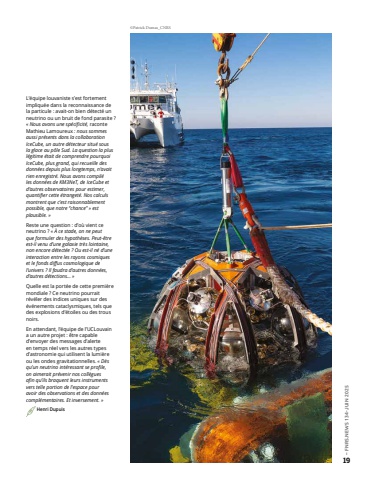 19%u2013 FNRS.NEWS 134-JUIN 2025L%u2019%u00e9quipe louvaniste s%u2019est fortement impliqu%u00e9e dans la reconnaissance de la particule%u00a0: avait-on bien d%u00e9tect%u00e9 un neutrino ou un bruit de fond parasite%u00a0? %u00ab%u00a0Nous avons une sp%u00e9cificit%u00e9, raconte Mathieu Lamoureux%u00a0: nous sommes aussi pr%u00e9sents dans la collaboration IceCube, un autre d%u00e9tecteur situ%u00e9 sous la glace au p%u00f4le Sud. La question la plus l%u00e9gitime %u00e9tait de comprendre pourquoi IceCube, plus grand, qui recueille des donn%u00e9es depuis plus longtemps, n%u2019avait rien enregistr%u00e9. Nous avons compil%u00e9 les donn%u00e9es de KM3NeT, de IceCube et d%u2019autres observatoires pour estimer, quantifier cette %u00e9tranget%u00e9. Nos calculs montrent que c%u2019est raisonnablement possible, que notre %u2018%u2019chance%u2019%u2019%u00a0%u00bb est plausible.%u00a0%u00bbReste une question%u00a0: d%u2019o%u00f9 vient ce neutrino ? %u00ab%u00a0%u00c0 ce stade, on ne peut que formuler des hypoth%u00e8ses. Peut-%u00eatre est-il venu d%u2019une galaxie tr%u00e8s lointaine, non encore d%u00e9tect%u00e9e ? Ou est-il n%u00e9 d%u2019une interaction entre les rayons cosmiques et le fonds diffus cosmologique de l%u2019univers%u00a0? Il faudra d%u2019autres donn%u00e9es, d%u2019autres d%u00e9tections%u2026%u00a0%u00bb Quelle est la port%u00e9e de cette premi%u00e8re mondiale ? Ce neutrino pourrait r%u00e9v%u00e9ler des indices uniques sur des %u00e9v%u00e9nements cataclysmiques, tels que des explosions d%u2019%u00e9toiles ou des trous noirs.En attendant, l%u2019%u00e9quipe de l%u2019UCLouvain a un autre projet%u00a0: %u00eatre capable d%u2019envoyer des messages d%u2019alerte en temps r%u00e9el vers les autres types d%u2019astronomie qui utilisent la lumi%u00e8re ou les ondes gravitationnelles. %u00ab%u00a0D%u00e8s qu%u2019un neutrino int%u00e9ressant se profile, on aimerait pr%u00e9venir nos coll%u00e8gues afin qu%u2019ils braquent leurs instruments vers telle portion de l%u2019espace pour avoir des observations et des donn%u00e9es compl%u00e9mentaires. Et inversement.%u00a0%u00bb Henri Dupuis%u00a9Patrick Dumas_CNRS
