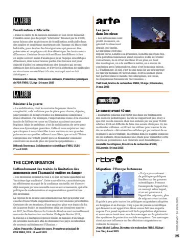 25%u2013 FNRS.NEWS 134-JUIN 2025Fossilisation artificielle %u00ab%u00a0Dans le cadre de la mission Exomars et son rover Rosalind Franklin ainsi que du projet %u201cLifeforms%u201d financ%u00e9 par le FNRS, nous faisons des exp%u00e9riences de fossilisation artificielle dans des argiles et conditions martiennes de l%u2019%u00e9poque o%u00f9 Mars %u00e9tait habitable, pour %u00e9valuer les biosignatures qui peuvent %u00eatre pr%u00e9serv%u00e9es et ce qui pourrait %u00eatre d%u00e9tect%u00e9 par les instruments d%u2019Exomars. Certains de nos %u00e9chantillons fossilif%u00e8res riches en argile servent aussi d%u2019analogues pour l%u2019%u00e9quipe scientifique d%u2019Exomars, dont nous faisons partie. Ces travaux ont pour objectif d%u2019aider les interpr%u00e9tations des donn%u00e9es qui seront obtenues lors de la mission, et d%u2019%u00e9viter la d%u00e9tection de mol%u00e9cules ou structures ressemblant %u00e0 la vie, mais qui sont en fait abiotiques.%u00a0%u00bbEmmanuelle Javaux, Professeure ordinaire, Promotrice principale de PDR FNRS, ULi%u00e8ge | 24 mars 2025R%u00e9sister %u00e0 la guerre%u00ab%u00a0La mobilisation, c%u2019est le contraire de penser dans la complexit%u00e9%u00a0: cela ne laisse pas de place pour douter, objecter, pour prendre en compte toutes les dimensions complexes d%u2019une situation. Par exemple, l%u2019imp%u00e9rialisme russe et la violence inou%u00efe de l%u2019offensive russe en Ukraine suscitent une peur l%u00e9gitime. Mais le probl%u00e8me, c%u2019est la mobilisation de cette peur dans une dynamique guerri%u00e8re. Celle-ci nous enjoint en tant que citoyens %u00e0 nous identifier %u00e0 nos nations ou aux grandes puissances auxquelles celles-ci sont li%u00e9es, que ce soit l%u2019Union europ%u00e9enne ou l%u2019OTAN, plut%u00f4t qu%u2019%u00e0 se demander comment construire un monde plus s%u00fbr pour les populations.%u00a0%u00bbD%u00e9borah Brosteaux, Collaboratrice scientifique FNRS, ULB |1er avril 2025L%u2019effondrement des trait%u00e9s de limitation des armements met l%u2019humanit%u00e9 enti%u00e8re en danger %u00ab%u00a0Ces d%u00e9cisions ouvrent la voie %u00e0 ce que certains qualifient de %u2018%u2019troisi%u00e8me %u00e2ge nucl%u00e9aire%u2019%u2019. Cette nouvelle %u00e8re, caract%u00e9ris%u00e9e par un effritement marqu%u00e9 de la confiance mutuelle, est d%u2019ores et d%u00e9j%u00e0 marqu%u00e9e par une nouvelle course aux armements, qui allie politique de modernisation et augmentations quantitatives des%u00a0arsenaux.La reprise de la course aux armements ne fait qu%u2019ajouter une couche d%u2019incertitude suppl%u00e9mentaire et de tensions potentielles. Certaines de ces tensions, d%u2019une ampleur plus vue depuis la fin de la guerre froide, se manifestent d%u00e9j%u00e0 ces derni%u00e8res ann%u00e9es%u00a0: en 2017, les %u00c9tats-Unis et la Cor%u00e9e du Nord se sont mutuellement menac%u00e9s de destruction nucl%u00e9aire. Et depuis f%u00e9vrier 2022, la%u00a0Russie a %u00e0 multiples reprises brandi la menace d%u2019un usage de%u00a0la bombe nucl%u00e9aire afin de dissuader les pays occidentaux de%u00a0soutenir militairement l%u2019Ukraine.%u00a0%u00bbJulien Pomar%u00e8de, Charg%u00e9 de cours, Promoteur principal de PDR%u00a0FNRS, ULB | 13 avril 2025Les yeux dans%u00a0les%u00a0cieux %u00ab%u00a0Les astronomes sont plut%u00f4t casaniers, en g%u00e9n%u00e9ral ils observent depuis leur jardin. Le%u00a0probl%u00e8me c%u2019est que, depuis Paris, Londres ou Bruxelles, la m%u00e9t%u00e9o n%u2019est pas top. Et la pollution lumineuse vient s%u2019ajouter. L%u2019id%u00e9e est d%u2019aller voir ailleurs, l%u00e0 o%u00f9 il fait meilleur. Et en plus, en haut des montagnes, on a la meilleure m%u00e9t%u00e9o, on a moins de confusion avec l%u2019atmosph%u00e8re, donc c%u2019est beaucoup mieux. [%u2026] Finalement, le ciel, c%u2019est ce qui nous lie un peu partout en tant qu%u2019humain et l%u2019astronomie, c%u2019est la science qu%u2019on fait partout dans le monde%u00a0: les aborig%u00e8nes, les Incas, les%u00a0Esquimaux faisaient de l%u2019astronomie.%u00a0%u00bbYa%u00ebl Naz%u00e9, Ma%u00eetre de recherches FNRS, ULi%u00e8ge | 28 minutes, 14%u00a0mai 2025Le cancer avant 40%u00a0ans%u00ab%u00a0L%u2019industrie pharma n%u2019investit pas dans les traitements des cancers p%u00e9diatriques, car ils ne rapportent pas. Il n%u2019y a que 350 cas de cancers chez des enfants par an pour 75.000 adultes. Et il est difficile de faire des essais cliniques. Or, les mol%u00e9cules utilis%u00e9es - et il faut les utiliser pour sauver la vie de ces enfants - d%u00e9truisent les cellules qui permettent de se r%u00e9g%u00e9n%u00e9rer. En les traitant, on entame donc le capital jeunesse de ces enfants. Nous menons une %u00e9tude pour quantifier cette vieillesse pr%u00e9matur%u00e9e. Les r%u00e9sultats sont dramatiques.%u00a0%u00bbAnabelle Decottignies, Directrice de recherches FNRS, UCLouvain | 14 mai 2025Migration%u00a0: l%u2019Europe forteresse%u00ab%u00a0Il n%u2019y a pas vraiment de politiques publiques fond%u00e9es sur les preuves scientifiques. Prenons l%u2019exemple de l%u2019appel d%u2019air, ce concept selon lequel, si on est g%u00e9n%u00e9reux %u00e0 l%u2019%u00e9gard des migrants, plus de migrants vont arriver. Il guide %u00e0 peu pr%u00e8s toutes les politiques migratoires adopt%u00e9es en Belgique et en Europe. Il n%u2019y a pas de preuve scientifique qui d%u00e9montre cet appel d%u2019air. Nous avons fait une enqu%u00eate aupr%u00e8s d%u2019un panel repr%u00e9sentatif de la population alg%u00e9rienne et nous avons test%u00e9 avec eux des messages sur la g%u00e9n%u00e9rosit%u00e9 des syst%u00e8mes de protection sociale europ%u00e9ens. Ces messages n%u2019ont aucune influence sur les d%u00e9cisions migratoires ou volont%u00e9s de migrer.%u00a0%u00bbJean-Michel Lafleur, Directeur de recherches FNRS, ULi%u00e8ge |Les Cl%u00e9s, 4 mai 2025