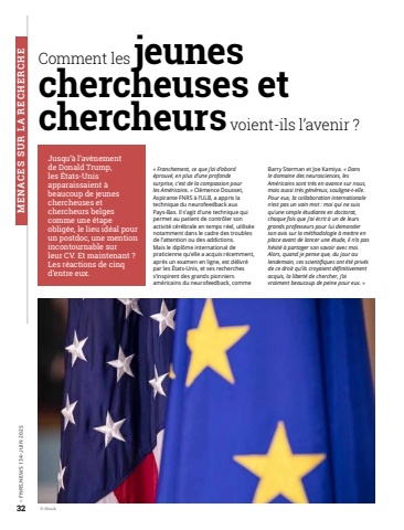 32%u2013 FNRS.NEWS 134-JUIN 2025Jusqu%u2019%u00e0 l%u2019av%u00e8nement de%u00a0Donald Trump, les%u00a0%u00c9tats-Unis apparaissaient %u00e0 beaucoup de jeunes chercheuses et chercheurs belges comme une %u00e9tape oblig%u00e9e, le%u00a0lieu id%u00e9al pour un postdoc, une mention incontournable sur leur%u00a0CV. Et maintenant%u00a0? Les r%u00e9actions de cinq d%u2019entre eux.Comment les jeunes chercheuses et chercheurs voient-ils l%u2019avenir%u00a0? %u00ab%u00a0Franchement, ce que j%u2019ai d%u2019abord %u00e9prouv%u00e9, en plus d%u2019une profonde surprise, c%u2019est de la compassion pour les Am%u00e9ricains.%u00a0%u00bb Cl%u00e9mence Dousset, Aspirante FNRS %u00e0 l%u2019ULB, a appris la technique du neurofeedback aux Pays-Bas. Il s%u2019agit d%u2019une technique qui permet au patient de contr%u00f4ler son activit%u00e9 c%u00e9r%u00e9brale en temps r%u00e9el, utilis%u00e9e notamment dans le cadre des troubles de l%u2019attention ou des addictions. Mais%u00a0le%u00a0dipl%u00f4me international de praticienne qu%u2019elle a acquis r%u00e9cemment, apr%u00e8s un examen en ligne, est d%u00e9livr%u00e9 par les %u00c9tats-Unis, et ses recherches s%u2019inspirent des grands pionniers am%u00e9ricains du neurofeedback, comme Barry Sterman et Joe Kamiya. %u00ab%u00a0Dans le domaine des neurosciences, les Am%u00e9ricains sont tr%u00e8s en avance sur nous, mais aussi tr%u00e8s g%u00e9n%u00e9reux, souligne-t-elle. Pour eux, la%u00a0collaboration internationale n%u2019est pas un vain mot%u00a0: moi qui ne suis qu%u2019une simple %u00e9tudiante en doctorat, chaque fois que j%u2019ai %u00e9crit %u00e0 un de leurs grands professeurs pour lui demander son avis sur la m%u00e9thodologie %u00e0 mettre en place avant de lancer une %u00e9tude, il n%u2019a pas h%u00e9sit%u00e9 %u00e0 partager son savoir avec moi. Alors, quand je pense que, du jour au lendemain, ces scientifiques ont %u00e9t%u00e9 priv%u00e9s de ce droit qu%u2019ils croyaient d%u00e9finitivement acquis, la libert%u00e9 de chercher, j%u2019ai vraiment beaucoup de peine pour eux.%u00a0%u00bbMENACES SUR LA RECHERCHE%u00a9 iStock