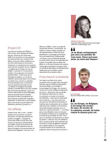33%u2013 FNRS.NEWS 134-JUIN 2025Project 25Lo%u00efc Fierens est Boursier FRESH %u00e0 l%u2019UCLouvain, dans l%u2019%u00e9quipe de Val%u00e9rie Rosoux, Directrice de recherches FNRS. Il se concentre sur les questions de m%u00e9moire li%u00e9es aux conflits arm%u00e9s. M%u00eame s%u2019il est loin d%u2019%u00eatre indiff%u00e9rent au sort des chercheuses et chercheurs am%u00e9ricains, il%u00a0comprend mal la surprise exprim%u00e9e par%u00a0la plupart de ses coll%u00e8gues.%u00ab%u00a0Il%u00a0suffisait de lire Project 25, tout est dedans !%u00a0%u00bb pr%u00e9cise-t-il. Ce document, intitul%u00e9 %u00ab%u00a0Un projet pour la transition pr%u00e9sidentielle%u00a0%u00bb, a %u00e9t%u00e9 con%u00e7u par la Heritage Foundation, un cercle de r%u00e9flexion ultraconservateur tr%u00e8s influent aux %u00c9tats-Unis, comme un v%u00e9ritable manuel politique pour un %u00e9ventuel second mandat de Donald%u00a0Trump. %u00ab%u00a0Je%u00a0d%u00e9teste les analogies historiques puisque je travaille dessus et je%u00a0sais combien elles sont instrumentalis%u00e9es, insiste Lo%u00efc Fierens. Mais le fait est qu%u2019en Allemagne, avant la Seconde%u00a0Guerre mondiale, tout %u00e9tait %u00e9crit dans le programme du Parti national-socialiste des travailleurs allemands. Ils avaient dit ce qu%u2019ils allaient faire, et ils ont fait ce qu%u2019ils%u00a0avaient dit. Seulement, personne n%u2019y avait cru.%u00a0%u00bb Un r%u00e9flexeJuliette Faure, elle, y croit%u00a0: %u00ab%u00a0Quand quelqu%u2019un est au pouvoir ou proche du pouvoir, il ne faut pas prendre ses paroles %u00e0%u00a0la l%u00e9g%u00e8re !%u00a0%u00bb Charg%u00e9e de recherches FNRS %u00e0 l%u2019ULB, elle a %u00e9t%u00e9, durant son doctorat, Visiting Fellow %u00e0 la Higher%u00a0School of Economics de Moscou, %u00ab%u00a0et mon exp%u00e9rience avec la Russie m%u2019a appris %u00e0 ne%u00a0pas minimiser les discours des dirigeants%u00a0: chez moi, c%u2019est devenu un r%u00e9flexe%u00a0%u00bb. Avec un projet de recherches intitul%u00e9 %u00ab%u00a0Cosmisme(s)%u00a0: de l%u2019URSS %u00e0 la Silicon Valley. Enqu%u00eate sur des appropriations modernes de la plan%u00e9tarit%u00e9%u00a0%u00bb, le passage par les %u00c9tatsUnis est %u00e9videmment indispensable. %u00ab%u00a0En Russie, j%u2019ai pris l%u2019habitude d%u2019%u00e9voluer en%u00a0terrain min%u00e9, mais%u00a0je%u00a0ne m%u2019attendais pas %u00e0 devoir m%u2019inqui%u00e9ter pour les %u00c9tats-Unis. M%u00eame si ce n%u2019est pas vraiment une surprise%u00a0: l%u2019entourage du pr%u00e9sident n%u2019a jamais cach%u00e9 sa volont%u00e9 de d%u00e9manteler les %u00e9tablissements intellectuels qu%u2019il consid%u00e8re comme adversaires de ses propres id%u00e9es.%u00a0%u00bb From bench to bedsideSon s%u00e9jour aux %u00c9tats-Unis, entre novembre 2019 et juillet 2020, Georgios Petrellis, Aspirant FNRS au laboratoire de parasitologie, vaccinologie et immunologie de l%u2019ULi%u00e8ge, s%u2019en souvient comme d%u2019%u00ab%u00a0une des meilleures exp%u00e9riences de ma vie%u00a0%u00bb. Apr%u00e8s avoir fait ses %u00e9tudes de m%u00e9decine v%u00e9t%u00e9rinaire en Gr%u00e8ce, il a entrepris un master en sciences biom%u00e9dicales, %u00ab%u00a0parce que je voulais faire de la recherche%u00a0%u00bb. C%u2019est ainsi qu%u2019il s%u2019est retrouv%u00e9 aux NIH (National Institutes of Health), dans le laboratoire de la c%u00e9l%u00e8bre sp%u00e9cialiste des maladies %u00e0 transmission vectorielle Shaden Kamhawi, avec un statut de %u00ab%u00a0Special Volunteer%u00a0%u00bb%u00a0: %u00ab%u00a0Je n%u2019avais pas un visa d%u2019%u00e9tudiant, mais un visa pour la recherche. Et d%u00e9couvrir la conception de la recherche qui pr%u00e9valait aux NIH - frombench to bedside, du laboratoire au chevet du patient %u2013 a %u00e9t%u00e9 pour moi une r%u00e9v%u00e9lation. Alors, j%u2019ai beaucoup de mal %u00e0 admettre que les %u00e9normes coupes budg%u00e9taires impos%u00e9es par la Maison-Blanche vont emp%u00eacher un grand nombre de ces chercheurs de progresser dans la voie qu%u2019ils ont choisie !%u00a0%u00bb Lo%u00efc Fierens, Boursier FRESH FNRS, ISPOLE, UCLouvain Ici, en Europe, en Belgique, il%u00a0est temps de recr%u00e9er du sens, de recr%u00e9er de la%u00a0coh%u00e9sion sociale, de lutter contre le chacun pour soi.Cl%u00e9mence Dousset, Aspirante FNRS, Laboratoire de psychologie m%u00e9dicale et addictologie, ULBJe ne dirais certainement pas non %u00e0 un postdoc de trois mois. Parce qu%u2019%u00e0 mes yeux, %u00e7a reste une chance !