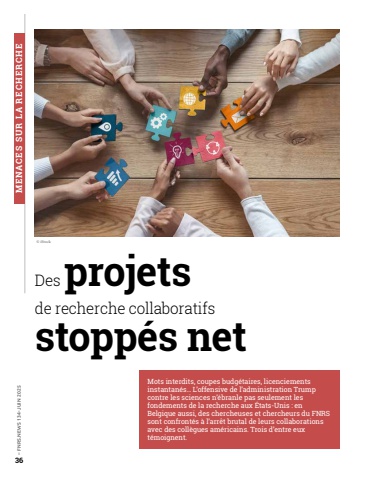36%u2013 FNRS.NEWS 134-JUIN 2025Mots interdits, coupes budg%u00e9taires, licenciements instantan%u00e9s%u2026 L%u2019offensive de l%u2019administration Trump contre les sciences n%u2019%u00e9branle pas seulement les fondements de la recherche aux %u00c9tats-Unis%u00a0: en Belgique aussi, des chercheuses et chercheurs du FNRS sont confront%u00e9s %u00e0 l%u2019arr%u00eat brutal de leurs collaborations avec des coll%u00e8gues am%u00e9ricains. Trois d%u2019entre eux t%u00e9moignent.Des projetsde recherche collaboratifsstopp%u00e9s netMENACES SUR LA RECHERCHE%u00a9 iStock