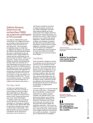 37%u2013 FNRS.NEWS 134-JUIN 2025Val%u00e9rie Rosoux, Directrice de recherches FNRS en%u00a0sciences politiques %u00e0 l%u2019UCLouvainIl y a cinq ans, Val%u00e9rie Rosoux a %u00e9t%u00e9 contact%u00e9e par une coll%u00e8gue am%u00e9ricaine, qui travaillait au National Democratic Institute, l%u2019institut de recherche du parti%u00a0d%u00e9mocrate. %u00ab%u00a0Elle m%u2019a propos%u00e9 un%u00a0magnifique projet, au Congo, dans un%u00a0village pr%u00e8s de l%u2019%u00c9quateur, qui subissait des violences intercommunautaires depuis des ann%u00e9es. L%u2019objectif %u00e9tait de cr%u00e9er des formateurs locaux, charg%u00e9s d%u2019%u00e9tablir des contacts entre les communaut%u00e9s via une forme de travail de m%u00e9moire. C%u2019%u00e9tait sur du long terme%u00a0: s%u2019asseoir autour de la table, accepter de se parler, %u00e7a prend beaucoup de temps. Mais nous nous %u00e9tions dit%u00a0: si cette m%u00e9thodologie lente fonctionne dans ce village, nous aurons un mod%u00e8le qui pourra %u00eatre r%u00e9pliqu%u00e9. Et puis, du jour au lendemain, la bourse am%u00e9ricaine a %u00e9t%u00e9 supprim%u00e9e, les chercheuses et chercheurs am%u00e9ricains qui en d%u00e9pendaient ont %u00e9t%u00e9 mis %u00e0 la porte, et tous ces gens, au Congo, qui avaient cru %u00e0 nos promesses, doivent se dire%u00a0: %u2018%u2019%u00c7a y est, on nous l%u00e2che de nouveau%u2019%u2019 . C%u2019est d%u2019abord %u00e7a qui est mis %u00e0 mal aux %u00c9tats-Unis%u00a0: la confiance dans l%u2019avenir et dans l%u2019autre%u2026%u00a0%u00bbUn lieu r%u00eav%u00e9Les %u00c9tats-Unis, Val%u00e9rie Rosoux les conna%u00eet bien. Elle a fait un postdoc %u00e0 la John Hopkins University au d%u00e9but des ann%u00e9es 2000, et, en 2010, elle a obtenu un mandat de recherche d%u2019une ann%u00e9e %u00e0 l%u2019USIP, l%u2019Institut des %u00c9tats-Unis pour la paix, bas%u00e9 %u00e0 Washington%u00a0: %u00ab%u00a0%u00c0%u00a0l%u2019%u00e9poque, c%u2019%u00e9tait le lieu au monde o%u00f9 tous les chercheurs et chercheuses qui travaillaient sur l%u2019apr%u00e8s-guerre, la gestion des conflits et la paix r%u00eavaient d%u2019%u00eatre. Mais, en mars dernier, Donald Trump a sign%u00e9 un d%u00e9cret visant %u00e0 le d%u00e9manteler%u2026 et sa base de donn%u00e9es, que tous les %u00e9tudiants et %u00e9tudiantes, tous les doctorants et doctorantes, tous les chercheurs et chercheuses consultaient a purement et simplement disparu. Quand je me suis rendue %u00e0 Washington, peu apr%u00e8s, j%u2019%u00e9tais tellement affect%u00e9e par la peur qu%u2019%u00e9prouvaient mes coll%u00e8gues am%u00e9ricains que j%u2019avais des moments de panique, je ne parvenais plus %u00e0 dormir ! Depuis vingt ans, je donne un cours intitul%u00e9 International Negotiation%u00a0: pendant soixante heures, je r%u00e9p%u00e8te %u00e0 mes %u00e9tudiantes et %u00e9tudiants que, dans la vie, o%u00f9 qu%u2019ils aillent et quoi qu%u2019ils fassent, ils devront penser inclusion, int%u00e9gration, coop%u00e9ration, et se souvenir qu%u2019on est toujours plus intelligents %u00e0 deux que s%u00e9par%u00e9ment. Toute une posture de%u00a0vie qui est actuellement contredite par%u00a0l%u2019efficacit%u00e9 %u00e0 court terme de Trump et de%u00a0son %u00e9quipe. %u00a0%u00bb AntidoteCette contradiction explique la surprise et la sid%u00e9ration qui ont domin%u00e9 les cent premiers jours du deuxi%u00e8me mandat de Trump. %u00ab%u00a0C%u2019est un ph%u00e9nom%u00e8ne qui me fait tr%u00e8s peur, parce que je crains qu%u2019il ne favorise une forme d%u2019%u2009%u2019%u2019infiltration%u2019%u2019. Je suis n%u00e9e %u00e0 Dinant et, quand j%u2019%u00e9tais petite, il y avait des inondations. Mais, bien avant que la Meuse n%u2019arrive jusque chez nous, notre cave %u00e9tait d%u00e9j%u00e0 remplie d%u2019eau. Par infiltration. Il en va de m%u00eame aujourd%u2019hui%u00a0: les r%u00e9seaux sociaux, notamment, activent par infiltration, dans l%u2019extr%u00eame droite et l%u2019extr%u00eame gauche, des forces de destruction, de polarisation, de fragmentation, de%u00a0frustration%u2026%u00a0%u00bb Comment r%u00e9agir pour ne pas %u00eatre d%u00e9truits par cette mar%u00e9e noire ? %u00ab%u00a0Certainement pas en nous fermant. Comme je l%u2019ai dit r%u00e9cemment %u00e0 un confr%u00e8re canadien, l%u2019antidote, c%u2019est l%u2019attitude inverse%u00a0: nous devons nous redresser, ouvrir d%u2019autres liens transatlantiques, d%u00e9cisifs pour les Am%u00e9ricains comme pour nous, trouver des bourses pour les scholars at risk, des projets dans lesquels int%u00e9grer des professeurs am%u00e9ricains%u2026 Moi, en tout cas, je fais tout ce que je peux, du matin au soir, pour construire des ponts%u00a0: pr%u00eater attention %u00e0 mes coll%u00e8gues am%u00e9ricains et am%u00e9ricaines, %u00e9crire, parler aux %u00e9tudiants%u2026 En esp%u00e9rant que ce comportement soit contagieux.%u00a0%u00bbAlexandre Heeren, Chercheur qualifi%u00e9 FNRS, IPSY, UCLouvainNous trouverons des%u00a0alternatives :les scientifiques sont des cr%u00e9atifs.Val%u00e9rie Rosoux,Directrice de recherches FNRS, ISPOLE, UCLouvainSaboter la confiance, c%u2019est%u00a0ouvrir la voie %u00e0 la terrorisation.