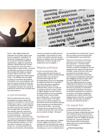 39%u2013 FNRS.NEWS 134-JUIN 2025f%u00e9vrier. %u00ab%u00a0Mes coll%u00e8gues %u00e9taient tr%u00e8s pessimistes. Et moi-m%u00eame, apr%u00e8s ce que la presse a appel%u00e9 la %u2018%u2018capitulation%u2019%u2019 de l%u2019Universit%u00e9 Columbia face %u00e0 Trump, je me suis dit qu%u2019il n%u2019%u00e9tait pas totalement impossible que, malgr%u00e9 ses capacit%u00e9s de r%u00e9sistance, Harvard finisse par s%u2019%u00e9craser aussi. En pareil cas, nous nous serions retrouv%u00e9s dans un autre monde %u2013 un monde o%u00f9 l%u2019%u00e9ducation, la science et la recherche libres auraient %u00e9t%u00e9 raval%u00e9es au rang de souvenirs. Mais le courrier du 11 avril contenant les exigences de l%u2019administration Trump %u2013 une v%u00e9ritable mise sous tutelle, au niveau du recrutement des %u00e9tudiants et %u00e9tudiantes et du corps enseignant, mais aussi du choix des priorit%u00e9s de recherche %u2013 %u00e9tait si scandaleux qu%u2019au fond, il a facilit%u00e9 la clarification n%u00e9cessaire. Son rejet par le pr%u00e9sident de Harvard a %u00e9t%u00e9 LA nouvelle dont nous avions besoin !%u00a0%u00bb A just economyMais la soci%u00e9t%u00e9 am%u00e9ricaine, dont la prosp%u00e9rit%u00e9 %u00e9conomique d%u00e9pend des innovations scientifiques, n%u2019est pas tir%u00e9e d%u2019affaire pour autant. %u00ab%u00a0La just economysur laquelle est ax%u00e9 notre centre ne figure pas dans la liste des mots interdits, mais c%u2019est un simple oubli%u00a0: il est clair que nous sommes concern%u00e9s, comme tous ceux qui travaillent sur la justice sociale et environnementale%u2026%u00a0%u00bb Elle-m%u00eame a renonc%u00e9 %u00e0 se rendre %u00e0 Harvard en mai%u00a0: %u00ab%u00a0Je n%u2019ai pas voulu prendre de risque inutile avant de mieux comprendre la situation%u00a0%u00bb. De%u00a0fa%u00e7on g%u00e9n%u00e9rale, d%u2019ailleurs, il ne faut pas c%u00e9der %u00e0 la tentation de r%u00e9agir au cas par cas. %u00ab%u00a0En nous poussant %u00e0 nous focaliser sur tel chercheur, telle institution, Trump et son %u00e9quipe nous d%u00e9tournent du vrai probl%u00e8me%u00a0: nous assistons %u00e0 la mise en place d%u2019un syst%u00e8me autoritaire de type fasciste. Les%u00a0attaques contre les institutions d%u2019%u00e9ducation, la science, les juges et les m%u00e9dias libres vont se multiplier.%u00a0%u00bbR%u00e9gime politiqueEt nous ne sommes pas %u00e0 l%u2019abri. %u00ab%u00a0Il%u00a0faut%u00a0comprendre qu%u2019en Europe, o%u00f9 s%u2019est%u00a0d%u00e9velopp%u00e9e une forme d%u2019internationale d%u2019extr%u00eame droite, nous sommes les prochains dans la ligne de mire. Je%u00a0travaille%u00a0depuis 20 ans sur le d%u00e9cryptage du capitalisme am%u00e9ricain et la question de la d%u00e9mocratie face au capitalisme. Dans mon livre de 2017, Firms as Political Entities, j%u2019insiste sur le fait que le%u00a0capitalisme doit %u00eatre compris comme un r%u00e9gime politique, qui vise %u00e0 r%u00e9server les%u00a0droits politiques %u00e0 ceux qui poss%u00e8dent du capital, et qui n%u2019a aucun respect pour la d%u00e9mocratie.%u00a0%u00bb C%u2019est%u00a0pourquoi, dans nos%u00a0d%u00e9mocraties, il est urgent de poursuivre la d%u00e9mocratisation de l%u2019%u00e9conomie comme de la sph%u00e8re politique. Et pas seulement par des d%u00e9clarations, si fermes soient-elles. %u00ab%u00a0Les%u00a0rectrices et recteurs de nos universit%u00e9s et le FNRS lui-m%u00eame ont %u00e9t%u00e9 tr%u00e8s clairs, mais%u00a0il ne faut pas se contenter de r%u00e9agir%u00a0: il faut agir !%u00a0%u00bb Solidarit%u00e9 Une urgence c%u00f4t%u00e9 acad%u00e9mique ? Isabelle Ferreras sugg%u00e8re de r%u00e9activer l%u2019Union acad%u00e9mique internationale (UAI), cr%u00e9%u00e9e %u00e0 Bruxelles au sortir de la Premi%u00e8re Guerre mondiale pour nourrir la solidarit%u00e9 entre les scientifiques du monde entier, %u00e0 partir de la conviction qu%u2019une recherche libre est indispensable %u00e0 une soci%u00e9t%u00e9 libre. Quant aux chercheuses et chercheurs am%u00e9ricains, nous devons les soutenir plus que jamais. %u00ab%u00a0Il est donc temps de penser %u00e0 une sorte de plan Fulbright %u00e0%u00a0l%u2019envers, ou plut%u00f4t %u00e0 l%u2019europ%u00e9enne, tranche Isabelle Ferreras. Apr%u00e8s la Seconde Guerre mondiale, ce plan de bourses a %u00e9t%u00e9 con%u00e7u pour favoriser les %u00e9changes entre les %u00e9tudiants et chercheurs du monde entier et%u00a0les institutions acad%u00e9miques am%u00e9ricaines, avec%u00a0l%u2019obligation de toujours rentrer dans son pays d%u2019origine pour y contribuer. Pour %u00e9viter l%u2019effondrement d%u2019une science ind%u00e9pendante aux %u00c9tats-Unis et ses effets, qui seraient catastrophiques pour le pays, inversons la proposition, en permettant aux %u00e9tudiantes et %u00e9tudiants, chercheuses et chercheurs am%u00e9ricains de se ressourcer un an dans une institution acad%u00e9mique europ%u00e9enne, pour repartir plus forts des r%u00e9sultats de leurs recherches, et contribuer %u00e0 r%u00e9tablir, dans leur pays, la qualit%u00e9 de la%u00a0science et la libert%u00e9 de chercher.%u00a0%u00bbUn signal fort%u00ab%u00a0Nous devons envoyer un signal fort d%u2019unit%u00e9 au service de la science libre, pour que Trump et son %u00e9quipe comprennent que nous nous mobiliserons pour toute chercheuse ou tout chercheur arr%u00eat%u00e9, quelle que soit sa nationalit%u00e9, et que nos coll%u00e8gues qui partent aux %u00c9tats-Unis, s%u2019exposant sciemment %u00e0%u00a0des%u00a0risques de plus en plus grands, sachent qu%u2019ils ont le soutien du FNRS et de%u00a0ses homologues.%u00a0%u00bb Marie-Fran%u00e7oise Dispa%u00a9 iStock