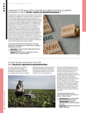 4%u2013 FNRS.NEWS 134-JUIN 2025Comment l%u2019UE peut-elle contribuer %u00e0 d%u00e9mocratiser la sph%u00e8re publique et ainsi lutter contre la d%u00e9sinformation ?L%u2019%u00e9mergence des r%u00e9seaux sociaux comme espace cl%u00e9 de la sph%u00e8re publique, et la propagation de la d%u00e9sinformation, cons%u00e9quence de leur mod%u00e8le %u00e9conomique de %u00ab%u00a0capitalisme de surveillance%u00a0%u00bb, ont ouvert de vastes d%u00e9bats politiques et r%u00e9glementaires %u00e0 travers le monde. L%u2019UE s%u2019est souvent positionn%u00e9e comme un leader normatif et un acteur de r%u00e9f%u00e9rence. Malheureusement, la r%u00e9glementation europ%u00e9enne en mati%u00e8re de d%u00e9sinformation %u2013 principalement le Digital Services Act (DSA) et le Code de bonnes pratiques contre la d%u00e9sinformation %u2013 s%u2019est concentr%u00e9e sur des changements technocratiques qui ne s%u2019attaquent pas %u00e0 la cause profonde du probl%u00e8me%u00a0: le mod%u00e8le %u00e9conomique bas%u00e9 sur la publicit%u00e9 cibl%u00e9e des entreprises de r%u00e9seaux sociaux. Dans cet article, l%u2019auteur et l%u2019autrice pr%u00e9sentent un ensemble de priorit%u00e9s pour imaginer des alternatives aux r%u00e9seaux sociaux actuels et examinent le r%u00f4le que pourrait jouer l%u2019UE dans leur d%u00e9veloppement. Plut%u00f4t qu%u2019une solution unique aux plateformes priv%u00e9es, il leur semble n%u00e9cessaire d%u2019envisager plusieurs alternatives. Leur argument principal%u00a0: la lutte contre la d%u00e9sinformation n%u2019est qu%u2019un aspect d%u2019une t%u00e2che plus vaste de d%u00e9mocratisation de la sph%u00e8re publique.%u00ab%u00a0Reversing the Privatisation of the Public Sphere%u00a0: Democratic Alternatives to the EU%u2019s Regulation of Disinformation%u00a0%u00bb, Media and Communication, avril 2025.Alvaro Oleart, Charg%u00e9 de recherches FNRS, D%u00e9partement de Science politique, ULBJulia Rone, Assistant Professor, D%u00e9partement de Science politique, Vrije Universiteit AmsterdamCe que la gouvernance nous dit des mesures agroenvironnementalesLes mesures agroenvironnementales sont%u00a0con%u00e7ues pour accompagner les%u00a0agriculteurs vers des pratiques plus favorables %u00e0 la biodiversit%u00e9. Pourtant, leurs r%u00e9sultats restent souvent modestes. Cette %u00e9tude propose une lecture en termes de gouvernance pour mieux comprendre ces limites. Les chercheurs et chercheuses ont identifi%u00e9 des obstacles %u00e0 trois niveaux%u00a0:%u00e0 l%u2019%u00e9chelle macro (cadres politiques et financiers), m%u00e9so (organisations de mise en %u0153uvre comme les administrations ou chambres d%u2019agriculture), et micro (acteurs de terrain comme les agriculteurs ou associations locales). Ces barri%u00e8res sont fr%u00e9quemment interconnect%u00e9es et traversent les responsabilit%u00e9s institutionnelles. Certains acteurs sont confront%u00e9s %u00e0 ces blocages sans disposer de moyens d%u2019action. Au-del%u00e0 d%u2019ajustements techniques ou financiers, l%u2019%u00e9tude montre qu%u2019une meilleure coordination des r%u00f4les et des ressources est n%u00e9cessaire pour am%u00e9liorer l%u2019efficacit%u00e9 des politiques. Le travail repose sur un cas d%u2019%u00e9tude en Hauts-de-France, impliquant de nombreux acteurs publics, agricoles et associatifs.%u00ab%u00a0A governance perspective on agrienvironmental schemes%u00a0: Actors, roles, and barriers%u00a0%u00bb, Ambio, avril 2025.*Diana Borniotto, Boursi%u00e8re FRIA FNRS, Earth and Life Institute, UCLouvainCl%u00e9mentine Antier, Charg%u00e9e de recherches FNRS, Earth and Life Institute, UCLouvainPhilippe Baret, Professeur, Earth and Life Institute, UCLouvain%u00a9 iStock%u00a9 iStockL%u2019ast%u00e9risque renvoie %u00e0 la premi%u00e8re autrice ou au premier auteur. NEWS