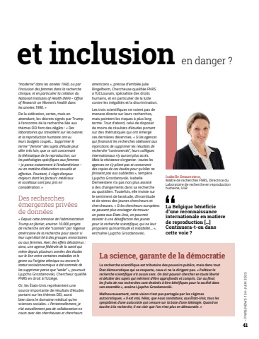 41%u2013 FNRS.NEWS 134-JUIN 2025et inclusion en danger ?%u201cmoderne%u201d dans les ann%u00e9es 1960, ou par l%u2019inclusion des femmes dans la recherche clinique, et en particulier la cr%u00e9ation du National Institutes of Health (NIH) %u2013 Office of Research on Women%u2019s Health dans les%u00a0ann%u00e9es 1990.%u00a0%u00bbDe la sid%u00e9ration, certes, mais en attendant, les d%u00e9crets sign%u00e9s par Trump %u00e0 l%u2019encontre de la recherche li%u00e9e aux th%u00e8mes DEI font des d%u00e9g%u00e2ts%u00a0: %u00ab%u00a0Des laboratoires qui travaillent sur les%u00a0ovaires et la reproduction humaine ont vu leurs budgets coup%u00e9s%u2026 Supprimer%u00a0le terme %u201c femme%u201d des sujets d%u2019%u00e9tude peut aller tr%u00e8s loin, que%u00a0ce soit concernant la%u00a0th%u00e9matique de la reproduction, sur les pathologies sp%u00e9cifiques aux femmes %u2013%u00a0je pense notamment %u00e0 l%u2019endom%u00e9triose%u00a0%u2013 ou en%u00a0mati%u00e8re d%u2019%u00e9ducation sexuelle et affective. Pourtant, il s%u2019agit d%u2019enjeux majeurs dont les facteurs m%u00e9dicaux et soci%u00e9taux sont peu pris en consid%u00e9ration.%u00a0%u00bbDes recherches %u00e9mergentes priv%u00e9es de%u00a0donn%u00e9es%u00ab%u00a0Depuis cette annonce de l%u2019administration Trump en f%u00e9vrier, environ 10.000 projets de recherche ont %u00e9t%u00e9 %u201cscann%u00e9s%u201d par l%u2019agence am%u00e9ricaine de la recherche pour savoir si leur sujet %u00e9tait li%u00e9 %u00e0 des groupes minoritaires ou aux femmes. Avec des effets d%u00e9sastreux%u00a0: ainsi, une agence f%u00e9d%u00e9rale de la sant%u00e9 qui m%u00e8ne depuis plusieurs ann%u00e9es des %u00e9tudes sur le lien entre certaines maladies et le genre ou l%u2019origine ethnique ou encore le statut socio%u00e9conomique a %u00e9t%u00e9 somm%u00e9e de les supprimer parce que %u201cwoke%u201d%u00a0%u00bb, poursuit Ljupcho Grozdanovski, Chercheur qualifi%u00e9 FNRS en droit %u00e0 l%u2019ULi%u00e8ge.Or, les %u00c9tats-Unis repr%u00e9sentent une source importante de r%u00e9sultats d%u2019%u00e9tudes portant sur les th%u00e8mes DEI, aussi bien dans le domaine m%u00e9dical qu%u2019en sciences sociales. %u00ab%u00a0Personnellement, je n%u2019ai actuellement pas de collaboration en cours avec des chercheuses et chercheurs am%u00e9ricains%u00a0%u00bb, pr%u00e9cise d%u2019embl%u00e9e Julie Ringelheim, Chercheuse qualifi%u00e9e FNRS %u00e0 l%u2019UCLouvain, sp%u00e9cialiste des droits humains, et en particulier de la lutte contre les in%u00e9galit%u00e9s et la discrimination.Les trois scientifiques ne voient pas de menace directe sur leurs recherches, mais pointent les risques %u00e0 plus long terme. Tout d%u2019abord, celui de disposer de moins de r%u00e9sultats d%u2019%u00e9tudes portant sur des th%u00e9matiques qui ont %u00e9merg%u00e9 ces derni%u00e8res d%u00e9cennies. %u00ab%u00a0Si les agences qui financent les recherches ob%u00e9issent aux injonctions de supprimer les r%u00e9sultats de recherche %u201ccontrovers%u00e9s%u201d, leurs coll%u00e8gues internationaux n%u2019y auront plus acc%u00e8s. Mais la r%u00e9sistance s%u2019organise%u00a0: toutes les agences ne s%u2019y plient pas et conservent des copies de ces %u00e9tudes pour qu%u2019elles ne finissent pas aux oubliettes%u00a0%u00bb, temp%u00e8re Ljupcho Grozdanovski. Isabelle Demeestere n%u2019a pas non plus assist%u00e9 %u00e0%u00a0des changements dans sa recherche au quotidien. Toutefois, elle insiste sur le sentiment de lassitude, d%u2019incertitude et de stress des jeunes chercheurs et chercheuses. %u00ab%u00a0Si les chercheurs europ%u00e9ens ne peuvent plus envisager de trouver un poste aux %u00c9tats-Unis, on pourrait assister %u00e0 une d%u00e9saffection des jeunes pour la recherche scientifique, qui ne leur proposera qu%u2019incertitude et instabilit%u00e9%u2026%u00a0%u00bb, encha%u00eene%u00a0Ljupcho Grozdanovski. Isabelle Demeestere,Ma%u00eetre de recherches FNRS, Directrice du Laboratoire de recherche en reproduction humaine, ULBLa Belgique b%u00e9n%u00e9ficie d%u2019une reconnaissance internationale en mati%u00e8re de%u00a0reproduction [%u2026] Continuera-t-on dans cette%u00a0voie ?La science, garante de la d%u00e9mocratieLa recherche scientifique est tributaire des pouvoirs publics, mais dans tout %u00c9tat d%u00e9mocratique qui se respecte, ceux-ci ne la dirigent pas. %u00ab%u00a0Politiser la recherche scientifique n%u2019a aucun sens. On doit pouvoir chercher en toute libert%u00e9 et d%u00e9cider des sujets qui m%u00e9ritent d%u2019%u00eatre approfondis et compris. Car au final, les%u00a0fruits de nos recherches sont destin%u00e9s %u00e0 %u00eatre b%u00e9n%u00e9fiques pour la soci%u00e9t%u00e9 dans son%u00a0ensemble%u00a0%u00bb, ass%u00e8ne Ljupcho Grozdanovski.Malheureusement, cette vision n%u2019est pas partag%u00e9e par les r%u00e9gimes autocratiques. %u00ab%u00a0Il est vrai, h%u00e9las, que nous constatons, aux %u00c9tats-Unis, tous les sympt%u00f4mes d%u2019une autocratie qui censure sur la base d%u2019une id%u00e9ologie. Quand on touche %u00e0 la recherche, il est clair que l%u2019on n%u2019est plus en d%u00e9mocratie.%u00a0%u00bb