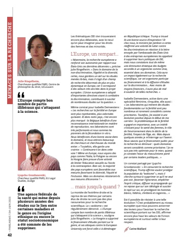 42%u2013 FNRS.NEWS 134-JUIN 2025Les th%u00e9matiques DEI s%u2019en trouveraient encore plus d%u00e9laiss%u00e9es, avec le recul qu%u2019on peut imaginer pour les%u00a0droits des%u00a0femmes et des minorit%u00e9s.L%u2019Europe, un rempart%u2026%u00ab%u00a0N%u00e9anmoins, la recherche europ%u00e9enne a renforc%u00e9 son autonomie par rapport aux %u00c9tats-Unis ces derni%u00e8res d%u00e9cennies%u00a0%u00bb, pr%u00e9cise Julie Ringelheim. %u00ab%u00a0Dans le domaine de la non-discrimination, l%u2019%u00e9galit%u00e9 et la diversit%u00e9, certes, nous gardons un %u0153il sur les %u00e9tudes men%u00e9es l%u00e0-bas, mais il s%u2019agit d%u2019un champ de recherche d%u00e9sormais de plus en plus dynamique en Europe, car il correspond %u00e0 des valeurs tr%u00e8s ancr%u00e9es dans le projet europ%u00e9en. L%u2019Union europ%u00e9enne a adopt%u00e9 d%u2019importantes directives visant %u00e0 combattre la discrimination, contribuant %u00e0 susciter de%u00a0nombreuses %u00e9tudes sur la question.%u00a0%u00bbM%u00eame constat pour Isabelle Demeestere%u00a0: %u00ab%u00a0Les recherches sur la fertilit%u00e9 en Europe sont plus repr%u00e9sent%u00e9es, plus valoris%u00e9es qu%u2019avant. Et dans notre pays, c%u2019est encore plus marqu%u00e9%u00a0: la Belgique b%u00e9n%u00e9ficie d%u2019une reconnaissance internationale en mati%u00e8re de reproduction, nos laboratoires sont tr%u00e8s%u00a0performants et nous sommes les pionniers de la f%u00e9condation in vitro. Nous b%u00e9n%u00e9ficions d%u2019une bonne assise dans le domaine, et nous attirons beaucoup de chercheurs et chercheuses du monde entier.%u00a0%u00bb Toutefois, elle garde une crainte%u00a0: %u00ab%u00a0Continuera-t-on dans cette voie ? M%u00eame%u00a0en Europe, nous voyons des pays comme l%u2019Italie, la Pologne ou encore la Hongrie faire preuve d%u2019une volont%u00e9 de%u00a0limiter l%u2019%u00e9ducation sexuelle ou l%u2019acc%u00e8s %u00e0 la%u00a0contraception. Bien s%u00fbr, la majorit%u00e9 des pays europ%u00e9ens sont favorables aux mesures favorisant la diversit%u00e9, l%u2019%u00e9quit%u00e9 et l%u2019inclusion. Mais%u00a0ces%u00a0domaines r%u00e9sisteront-ils aux mesures d%u2019%u00e9conomie ?%u00a0%u00bb... mais jusqu%u2019%u00e0 quand%u00a0?La mont%u00e9e de l%u2019extr%u00eame droite et la reprise de ses th%u00e8mes par certains %u00e9lus de droite ne sont pas des plus rassurantes pour la recherche scientifique. Le %u00ab%u00a0wokisme%u00a0%u00bb est r%u00e9guli%u00e8rement d%u00e9nonc%u00e9. %u00ab%u00a0L%u2019Europe compte bon nombre de partis illib%u00e9raux qui s%u2019attaquent %u00e0 la science%u00a0%u00bb, souligne Julie Ringelheim. %u00ab%u00a0La Hongrie a supprim%u00e9 le financement d%u2019%u00e9tudes portant sur le genre, et ses attaques contre la European University ont forc%u00e9 celle-ci %u00e0 d%u00e9m%u00e9nager en%u00a0R%u00e9publique tch%u00e8que. Trump a trouv%u00e9 l%u00e0 une bonne source d%u2019inspiration%u00a0! Et chez nous, le ministre Jan Jambon a certes r%u00e9affirm%u00e9 une volont%u00e9 de lutter contre les discriminations en r%u00e9action %u00e0 la lettre envoy%u00e9e par l%u2019ambassade des %u00c9tats-Unis %u00e0 des entreprises europ%u00e9ennes les appelant %u00e0 supprimer leurs politiques de%u00a0DEI, mais nous constatons tout de m%u00eame une diminution drastique des budgets accord%u00e9s %u00e0 un organisme comme Unia, essentiel dans ces domaines. Cela aura un impact %u00e9galement sur la recherche scientifique, car%u00a0cet organisme participe au%u00a0financement et %u00e0%u00a0la diffusion d%u2019%u00e9tudes sur%u00a0la discrimination%u2026 Avec moins de moyens financiers, il aura plus de mal %u00e0 soutenir de%u00a0telles recherches.%u00a0%u00bbIsabelle Demeestere, active dans une sp%u00e9cialit%u00e9 f%u00e9minine, s%u2019inqui%u00e8te, elle aussi%u00a0: %u00ab%u00a0Les laboratoires qui m%u00e8nent des %u00e9tudes fondamentales sur la fertilit%u00e9 sont peu nombreux et rarement consid%u00e9r%u00e9s comme prioritaires. Toutefois, j%u2019ai assist%u00e9 %u00e0 une %u00e9volution positive depuis le d%u00e9but de ma carri%u00e8re%u00a0: la probl%u00e9matique de la fertilit%u00e9 a gagn%u00e9 en importance, avec un int%u00e9r%u00eat croissant pour la sant%u00e9 des femmes, le r%u00f4le de l%u2019environnement dans le d%u00e9clin de la fertilit%u00e9, l%u2019impact de l%u2019%u00e2ge, etc. Mais depuis quelques ann%u00e9es je m%u2019interroge sur l%u2019avenir. Nous savons que le financement public pour la recherche va diminuer%u00a0: quels domaines seront consid%u00e9r%u00e9s comme prioritaires ? Je ne suis pas tr%u00e8s optimiste pour le mien, quand je constate l%u2019essor du masculinisme port%u00e9 par certains leaders politiques%u2026%u00a0%u00bbUn constat partag%u00e9 par Ljupcho Grozdanovski%u00a0: %u00ab%u00a0En censurant la recherche scientifique, Trump affirme vouloir prot%u00e9ger la population du %u201cwokisme%u201d%u00a0%u00bb, mais il cherche surtout %u00e0 supprimer ce qu%u2019il ne veut pas voir, favoriser l%u2019ignorance, emp%u00eacher l%u2019esprit critique, diffuser sa propagande qui ne repose que sur son id%u00e9ologie et susciter le repli sur soi, en privil%u00e9giant les hommes blancs, h%u00e9t%u00e9ros, chr%u00e9tiens et cisgenres%u2026%u00a0%u00bbEst-il possible de r%u00e9sister %u00e0 une telle %u00e9volution ? C%u2019est probablement au niveau europ%u00e9en que nous pouvons actionner des leviers pour favoriser la recherche scientifique portant sur les DEI, affirmer encore plus haut les valeurs de l%u2019Union europ%u00e9enne et surtout veiller %u00e0 leur respect. Carine MaillardJulie Ringelheim,Chercheuse qualifi%u00e9e FNRS, Centre de philosophie du droit, UCLouvainL%u2019Europe compte bon nombre de partis illib%u00e9raux qui s%u2019attaquent %u00e0 la science.Ljupcho Grozdanovski, Chercheur qualifi%u00e9 FNRS, EU Legal Studies, ULi%u00e8geUne agence f%u00e9d%u00e9rale de la sant%u00e9 qui m%u00e8ne depuis plusieurs ann%u00e9es des %u00e9tudes sur le lien entre cert