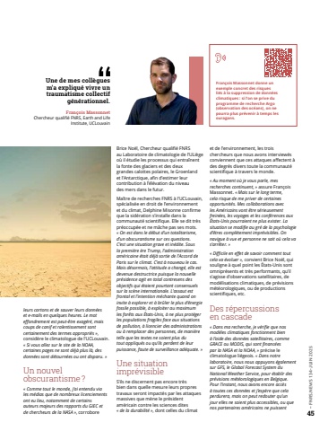 45%u2013 FNRS.NEWS 134-JUIN 2025leurs cartons et de sauver leurs donn%u00e9es et e-mails en quelques heures. Le mot effondrement est peut-%u00eatre exag%u00e9r%u00e9, mais coups de canif et ralentissement sont certainement des termes appropri%u00e9s%u00a0%u00bb, consid%u00e8re le climatologue de l%u2019UCLouvain. %u00ab%u00a0Si vous allez sur le site de la NOAA, certaines pages ne sont d%u00e9j%u00e0 plus l%u00e0, des donn%u00e9es sont d%u00e9tourn%u00e9es ou ont disparu.%u00a0%u00bb Un nouvel obscurantisme%u2006?%u00ab%u00a0Comme tout le monde, j%u2019ai entendu via les m%u00e9dias que de nombreux licenciements ont eu lieu, notamment de certains auteurs majeurs des rapports du GIEC et de chercheurs de la NASA%u00a0%u00bb, corrobore Brice No%u00ebl, Chercheur qualifi%u00e9 FNRS au%u00a0Laboratoire de climatologie de l%u2019ULi%u00e8ge o%u00f9 il %u00e9tudie les processus qui entra%u00eenent la fonte des glaciers et des deux grandes calottes polaires, le%u00a0Groenland et l%u2019Antarctique, afin d%u2019estimer leur contribution %u00e0 l%u2019%u00e9l%u00e9vation du niveau des%u00a0mers dans le futur.Ma%u00eetre de recherches FNRS %u00e0 l%u2019UCLouvain, sp%u00e9cialis%u00e9e en droit de l%u2019environnement et du climat, Delphine Misonne confirme que la sid%u00e9ration s%u2019installe dans la communaut%u00e9 scientifique. Elle se dit tr%u00e8s pr%u00e9occup%u00e9e et ne m%u00e2che pas ses mots. %u00ab%u00a0On est dans le d%u00e9but d%u2019un totalitarisme, d%u2019un obscurantisme sur ces questions. C%u2019est une situation grave et in%u00e9dite. Sous la premi%u00e8re %u00e8re Trump, l%u2019administration am%u00e9ricaine %u00e9tait d%u00e9j%u00e0 sortie de l%u2019Accord de Paris sur le climat. C%u2019est %u00e0 nouveau le cas. Mais d%u00e9sormais, l%u2019attitude a chang%u00e9, elle est devenue destructrice puisque la nouvelle pr%u00e9sidence agit en total contresens des objectifs qui %u00e9taient pourtant consensuels sur la sc%u00e8ne internationale. L%u2019assaut est frontal et l%u2019intention m%u00e9chante quand on invite %u00e0 explorer et %u00e0 br%u00fbler le plus d%u2019%u00e9nergie fossile possible, %u00e0 exploiter au maximum les for%u00eats aux %u00c9tats-Unis, %u00e0 ne plus prot%u00e9ger les populations fragiles face aux situations de pollution, %u00e0 licencier des administrations ou %u00e0 remplacer des personnes, de mani%u00e8re telle que les textes ne soient plus du tout appliqu%u00e9s ou qu%u2019ils perdent de leur puissance, faute de surveillance ad%u00e9quate.%u00a0%u00bbUne situation impr%u00e9visibleS%u2019ils ne discernent pas encore tr%u00e8s bien dans quelle mesure leurs propres travaux seront impact%u00e9s par les attaques massives que m%u00e8ne le pr%u00e9sident am%u00e9ricain contre les sciences dites %u00ab%u00a0de%u00a0la%u00a0durabilit%u00e9%u00a0%u00bb, dont celles du climat et%u00a0de l%u2019environnement, les trois chercheurs que nous avons interview%u00e9s conviennent que ces attaques affectent %u00e0 des degr%u00e9s divers toute la communaut%u00e9 scientifique %u00e0 travers le monde.%u00ab%u00a0Au moment o%u00f9 je vous parle, mes recherches continuent,%u00a0%u00bb assure Fran%u00e7ois Massonnet. %u00ab%u00a0Mais sur le long terme, cela risque de me priver de certaines opportunit%u00e9s. Mes collaborations avec les Am%u00e9ricains vont %u00eatre s%u00e9rieusement frein%u00e9es, les voyages et les conf%u00e9rences aux %u00c9tats-Unis pourraient ne plus exister. La situation se modifie au gr%u00e9 de la psychologie d%u2019%u00eatres compl%u00e8tement impr%u00e9visibles. On navigue %u00e0 vue et personne ne sait o%u00f9 cela va s%u2019arr%u00eater.%u00a0%u00bb%u00ab%u00a0Difficile en effet de savoir comment tout cela va %u00e9voluer%u00a0%u00bb, convient Brice No%u00ebl, qui souligne %u00e0 quel point les %u00c9tats-Unis sont omnipr%u00e9sents et tr%u00e8s performants, qu%u2019il s%u2019agisse d%u2019observations satellitaires, de mod%u00e9lisations climatiques, de pr%u00e9visions m%u00e9t%u00e9orologiques, ou de productions scientifiques, etc.Des r%u00e9percussions en%u00a0cascade%u00ab%u00a0Dans ma recherche, je v%u00e9rifie que nos mod%u00e8les climatiques fonctionnent bien %u00e0%u00a0l%u2019aide des donn%u00e9es satellitaires, comme GRACE ou MODIS, qui sont financ%u00e9es par la NASA et la NOAA,%u00a0%u00bb pr%u00e9cise le climatologue li%u00e9geois. %u00ab%u00a0Dans notre laboratoire, nous nous appuyons %u00e9galement sur GFS, le Global Forecast System du National Weather Service, pour %u00e9tablir des pr%u00e9visions m%u00e9t%u00e9orologiques en Belgique. Pour l%u2019instant, nous avons encore acc%u00e8s %u00e0 toutes ces donn%u00e9es et j%u2019esp%u00e8re que cela perdurera, mais on peut redouter qu%u2019un jour elles ne soient plus accessibles, ou que nos partenaires am%u00e9ricains ne puissent Une de mes coll%u00e8gues m%u2019a expliqu%u00e9 vivre un traumatisme collectif g%u00e9n%u00e9rationnel.Fran%u00e7ois MassonnetChercheur qualifi%u00e9 FNRS, Earth and Life Institute, UCLouvain Fran%u00e7ois Massonnet donne un exemple concret des risques li%u00e9s %u00e0 la suppression de donn%u00e9es climatiques%u00a0: si l%u2019on se prive du programme de recherche Argo (observation des oc%u00e9ans), on ne pourra plus pr%u00e9venir %u00e0 temps les ouragans.