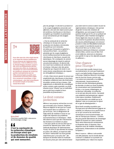 46%u2013 FNRS.NEWS 134-JUIN 2025plus les partager. Si cela doit se produire et si les coupes budg%u00e9taires annonc%u00e9es sont effectives, cela aura des r%u00e9percussions pour de nombreux chercheuses et chercheurs europ%u00e9ens qui travaillent en partenariat ou qui sont financ%u00e9s par des budgets am%u00e9ricains.%u00a0%u00bb%u00ab%u00a0C%u2019est la continuit%u00e9 de la recherche climatique en Europe ainsi que la production de r%u00e9sultats et de donn%u00e9es de%u00a0qualit%u00e9 qui sont menac%u00e9es, de m%u00eame que l%u2019innovation en g%u00e9n%u00e9ral%u00a0%u00bb, redoute Brice No%u00ebl. %u00ab%u00a0Les premiers p%u00e9nalis%u00e9s par les coupes budg%u00e9taires seront malheureusement les plus jeunes chercheuses et chercheurs, souvent tr%u00e8s dynamiques. Par cons%u00e9quent, les seniors auront davantage de travail et subiront une plus forte pression. Ils devront d%u00e8s lors revoir leurs ambitions de recherche %u00e0 la baisse. Cela peut cr%u00e9er des pertes d%u2019expertise qui risquent de mener %u00e0 une moins bonne compr%u00e9hension des impacts du r%u00e9chauffement climatique.%u00a0%u00bb%u00ab%u00a0%u00c0 cela, il faut encore ajouter la censure qui emp%u00eacherait des chercheuses et chercheurs europ%u00e9ens collaborant avec des Am%u00e9ricains de publier certains de leurs travaux. Cela engendrerait un d%u00e9sint%u00e9r%u00eat des scientifiques envers certains sujets essentiels, au profit d%u2019autres moins %u201cclivants%u201d qui ne mettraient pas en p%u00e9ril leurs emplois et leurs possibilit%u00e9s de financement.%u00a0%u00bbLe droit comme protectionM%u00eame si ses propres recherches ne sont pas entrav%u00e9es pour l%u2019instant, Delphine Misonne d%u00e9plore le fait que son travail soit impact%u00e9 dans sa substance. %u00ab%u00a0Ce qui est en jeu, c%u2019est un d%u00e9nigrement de l%u2019id%u00e9e m%u00eame de mobiliser le droit en vue d%u2019offrir des r%u00e9ponses aux probl%u00e8mes environnementaux et climatiques.%u00a0%u00bb Mais elle observe aussi que des m%u00e9canismes de r%u00e9sistance se mettent en place. %u00ab%u00a0C%u2019est pour partie au sein du droit que se trouvent les r%u00e9ponses pour lutter contre l%u2019attitude despotique de l%u2019administration Trump. On verra ce que donnent les actions en justice. Par ailleurs, le travail de veille de nature %u201cm%u00e9morielle%u201d est d%u2019une grande importance pour y voir plus clair%u00a0: des banques de donn%u00e9es listent la multitude de mesures prises par cette administration pour faire taire la science et faire reculer les r%u00e9glementations climatiques. Cela%u00a0permet de garder la trace des initiatives de d%u00e9r%u00e9gulation, qui vont jusqu%u2019%u00e0 remettre en question le fait que le CO2 est un polluant de l%u2019atmosph%u00e8re, dans l%u2019intention de fragiliser l%u2019assise l%u00e9gale des mesures en place. En ce qui concerne la question des financements, des %u0153uvres philanthropiques ont annonc%u00e9 prendre le relais de l%u2019%u00c9tat f%u00e9d%u00e9ral am%u00e9ricain pour soutenir le secr%u00e9tariat onusien de l%u2019Accord de Paris sur le climat. Il sera %u00e9galement int%u00e9ressant d%u2019observer comment certains %u00c9tats, comme ceux de New York et%u00a0de Californie, entreront en r%u00e9sistance pour garder le cap sur les objectifs auxquels ils adh%u00e8rent.%u00a0%u00bbUne chance pour%u00a0l%u2019Europe ?%u00c0 voir aussi dans quelle mesure tous ces %u00e9v%u00e9nements ne vont pas finalement ouvrir une belle fen%u00eatre d%u2019opportunit%u00e9s %u00e0 l%u2019Europe. Delphine Misonne n%u2019envisage pas du tout les choses comme cela. %u00ab%u00a0La science est universelle, et sa d%u00e9fense internationale. L%u2019environnement et le%u00a0climat sont des th%u00e9matiques globales, les%u00a0donn%u00e9es circulent sur toute la plan%u00e8te, les conversations sont transnationales. Et donc, si on tousse %u00e0 Washington, on va %u00e9ternuer %u00e0 Bruxelles. La recherche, ce ne sont pas des pr%u00e9s carr%u00e9s, c%u2019est plut%u00f4t une solidarit%u00e9 internationale par rapport %u00e0%u00a0des enjeux mondiaux. %u00c9videmment, il y aura peut-%u00eatre une vitalit%u00e9 qui va se d%u00e9placer, mais on ne peut pas se r%u00e9jouir de ce type de%u00a0d%u00e9veloppement.%u00a0%u00bbBrice No%u00ebl consid%u00e8re toutefois que l%u2019Europe pourrait effectivement gagner en visibilit%u00e9, en influence et en performance en ce qui concerne les recherches climatiques et environnementales, car elle ne manque pas d%u2019atouts. %u00ab%u00a0Certains des plus grands laboratoires de climatologie polaire se trouvent sur notre continent. Nous avons beaucoup de connaissances et d%u2019expertise dans ce domaine. Nous disposons aussi de mod%u00e8les climatiques performants, d%u2019observations et de satellites europ%u00e9ens.%u00a0%u00bbMais il nuance. %u00ab%u00a0M%u00eame si cela semble une id%u00e9e plaisante, tout le monde devrait continuer %u00e0 collaborer et %u00e0 prendre ses responsabilit%u00e9s pour r%u00e9duire les impacts Brice No%u00ebl Chercheur qualifi%u00e9 FNRS, Laboratoire de climatologie, ULi%u00e8geC%u2019est la continuit%u00e9 de la%u00a0recherche climatique en Europe ainsi que la%u00a0production de r%u00e9sultats et de donn%u00e9es de qualit%u00e9 qui sont menac%u00e9es. Pour aller plus loin, Brice No%u00ebl aborde ici le risque de climato-indiff%u00e9rence li%u00e9 aux mesures de l%u2019administration am%u00e9ricaine. Il fait la diff%u00e9rence avec la climato-fatigue r%u00e9sultant, quant %u00e0 elle, de la surm%u00e9diatisation parfois alarmiste des effets du changement climatique sur notre environnement. De nombreux r%u00e9sultats de recherche parfois contradictoires sont en effet communiqu%u00e9s au public sans confirmation qu%u2019ils font bien l%u2019objet d%u2019un consensus scientifique. Il faut communiquer %u00ab%u00a0des faits scientifiques de mani%u00e8re simple et honn%u00eate%u00a0%u00bb, insiste Brice No%u00ebl.MENACE