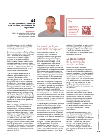 49%u2013 FNRS.NEWS 134-JUIN 2025ont %u00e9t%u00e9 brutalement arr%u00eat%u00e9s%u00a0: maladies infectieuses, m%u00e9decine spatiale, sant%u00e9 maternelle, cancers rares.Derri%u00e8re ces arr%u00eats, une inflexion politique. Sous couvert de lutter contre %u00ab%u00a0l%u2019id%u00e9ologie DEIA%u00a0%u00bb (diversit%u00e9, %u00e9quit%u00e9, int%u00e9gration, accessibilit%u00e9) ou contre le suppos%u00e9 activisme de certaines universit%u00e9s, l%u2019administration Trump a lanc%u00e9 une s%u00e9rie de coupes budg%u00e9taires massives, ciblant des institutions comme Harvard, Columbia ou le NIH lui-m%u00eame. L%u2019USAID est en voie de d%u00e9mant%u00e8lement fonctionnel. Et les cons%u00e9quences sont imm%u00e9diates.%u00ab%u00a0J%u2019ai des coll%u00e8gues dont les projets de recherche appliqu%u00e9e dans les pays du Sud ont %u00e9t%u00e9 brutalement stopp%u00e9s%u00a0%u00bb, t%u00e9moigne Sophie Lucas, chercheuse en immunoth%u00e9rapie du cancer, professeure %u00e0 l%u2019UCLouvain, Promotrice principale de projets de recherches FNRS et T%u00e9l%u00e9vie, et Investigatrice WEL Research Institute. %u00ab%u00a0Des cliniques de maternit%u00e9 ont ferm%u00e9 faute de soutien. Et dans certaines zones, la mortalit%u00e9 maternelle est repartie %u00e0 la hausse.%u00a0%u00bb Pour elle, l%u2019impact d%u00e9passe les fronti%u00e8res%u00a0: %u00ab%u00a0On ne coupe pas seulement des lignes de cr%u00e9dit. On affaiblit les r%u00e9seaux de soins, on freine la pr%u00e9vention, on d%u00e9stabilise des dynamiques de sant%u00e9 publique.%u00a0%u00bbM%u00eame en Belgique, les effets sont d%u00e9j%u00e0 perceptibles. %u00ab%u00a0J%u2019ai re%u00e7u r%u00e9cemment un antibiotique que j%u2019utilise r%u00e9guli%u00e8rement. Produit par une soci%u00e9t%u00e9 am%u00e9ricaine, fabriqu%u00e9 en Chine, distribu%u00e9 en Allemagne%u2026 Il co%u00fbte d%u00e9j%u00e0 tr%u00e8s cher%u00a0%u00bb, relate R%u00e9gis Hallez, Ma%u00eetre de recherches FNRS et microbiologiste %u00e0 l%u2019UNamur. %u00ab%u00a0Et ce n%u2019est que le d%u00e9but.%u00a0%u00bbIl craint des effets en cascade%u00a0: flamb%u00e9e des co%u00fbts, mobilit%u00e9 acad%u00e9mique entrav%u00e9e, recul de la coop%u00e9ration transatlantique, incertitude sur les congr%u00e8s internationaux. %u00ab%u00a0L%u2019id%u00e9e m%u00eame de se rendre aux %u00c9tats-Unis devient compliqu%u00e9e. Mais rompre les ponts serait une erreur.%u00a0%u00bbLa sant%u00e9 publique mondiale sans pilotePour %u00c9ric Muraille, Directeur de recherches FNRS, biologiste et immunologiste %u00e0 l%u2019ULB, ces d%u00e9cisions budg%u00e9taires ne sont qu%u2019une facette d%u2019un mouvement plus large. %u00ab%u00a0Ce qui m%u2019inqui%u00e8te encore davantage, c%u2019est la sortie programm%u00e9e des %u00c9tats-Unis de l%u2019Organisation mondiale de la sant%u00e9. C%u2019est un symbole fort, qui affaiblit l%u2019architecture multilat%u00e9rale de la sant%u00e9 publique mondiale. Cela envoie un signal de d%u00e9sengagement, %u00e0%u00a0l%u2019heure o%u00f9 la coordination internationale est plus n%u00e9cessaire que jamais.%u00a0%u00bb Il insiste%u00a0: la sant%u00e9 publique ne peut %u00eatre efficace que dans un cadre multilat%u00e9ral stable.Il appelle aussi %u00e0 replacer la s%u00e9quence actuelle dans une histoire plus longue. %u00ab%u00a0L%u2019interf%u00e9rence politique dans la recherche n%u2019est pas neuve. Sous Bush, la recherche sur les cellules souches avait d%u00e9j%u00e0 %u00e9t%u00e9 restreinte. Ce que fait Trump est plus brutal, plus erratique, mais il ne vient pas de nulle part.%u00a0%u00bb Ce qu%u2019il redoute surtout, c%u2019est l%u2019effet domino%u00a0: %u00ab%u00a0On suspend, on relance, puis on suspend %u00e0 nouveau. Ce chaos administratif provoque une perte de rep%u00e8res.%u00a0%u00bbEt une perte de souverainet%u00e9 scientifique globale. Car l%u2019Am%u00e9rique reste, de loin, le premier pourvoyeur de publications, de brevets et de r%u00e9sultats dans le domaine biom%u00e9dical. Sa d%u00e9sorganisation affaiblit m%u00e9caniquement les progr%u00e8s en mati%u00e8re de d%u00e9pistage, de traitement, de vaccination ou de r%u00e9ponse aux %u00e9pid%u00e9mies.%u00ab%u00a0Ce n%u2019est pas seulement l%u2019Am%u00e9rique qui vacille. C%u2019est toute une architecture mondiale qui tangue%u00a0: formations, copublications, appels conjoints%u2026%u00a0%u00bb, poursuit %u00c9ric Muraille. Il redoute, comme Sophie Lucas, un basculement vers une science %u00ab %u00e0 deux vitesses %u00bb, o%u00f9 la sant%u00e9 publique, l%u2019immunologie ou la pr%u00e9vention seraient de plus en plus marginalis%u00e9es. La Belgique, m%u00eame si elle semble rester %u00e0 l%u2019%u00e9cart des secousses imm%u00e9diates, pourrait %u00e0 terme ne pas %u00e9chapper %u00e0 cette polarisation rampante.La fragilisation de la recherche fondamentaleAu-del%u00e0 des projets appliqu%u00e9s, la%u00a0recherche fondamentale elle-m%u00eame risque de souffrir durablement de cette asphyxie budg%u00e9taire. %u00ab%u00a0Quand on coupe la source, c%u2019est toute la cha%u00eene de production de connaissances qui finit par se tarir%u00a0%u00bb, alerte Sophie Lucas. Elle %u00e9voque le risque d%u2019un appauvrissement scientifique %u00e0 long terme%u00a0: %u00ab%u00a0On n%u2019en voit pas tout de suite les effets, mais %u00e0 terme, c%u2019est une perte d%u2019impact, d%u2019innovation, de savoir, dans tous les domaines.%u00a0%u00bbCette attrition n%u2019est pas seulement financi%u00e8re, elle touche aussi %u00e0 la libert%u00e9 acad%u00e9mique, %u00e0 la capacit%u00e9 des chercheurs et chercheuses %u00e0 poser des questions ouvertes, sans injonction de rentabilit%u00e9 imm%u00e9diate. %u00ab%u00a0Le c%u0153ur de la recherche scientifique, c%u2019est d%u2019explorer des zones d%u2019ombre, d%u2019interroger ce qui n%u2019a pas encore %u00e9t%u00e9 r%u00e9solu. Ce sont ces d%u00e9marches-l%u00e0 qui sont aujourd%u2019hui menac%u00e9es%u00a0%u00bb, insiste Sophie Lucas.%u00c9ric Muraille abonde en ce sens%u