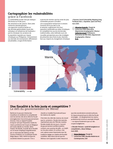 5%u2013 FNRS.NEWS 134-JUIN 2025%u00a9 Dujardin et al.Cartographier les vuln%u00e9rabilit%u00e9sgr%u00e2ce %u00e0 FacebookLa vuln%u00e9rabilit%u00e9 sociale n%u2019est pas statique%u00a0: elle %u00e9volue au fil des jours, des semaines et des saisons. Dans cette recherche interdisciplinaire, une approche novatrice bas%u00e9e sur des donn%u00e9es g%u00e9olocalis%u00e9es issues des utilisateurs et utilisatrices de Facebook a permis d%u2019analyser les variations de la population expos%u00e9e aux risques climatiques aux Philippines. Contrairement aux donn%u00e9es de recensement, difficilement actualisables, ce type d%u2019information a permis de montrer que les zones les plus vuln%u00e9rables peuvent conna%u00eetre une surpopulation temporaire %u00e0 certains moments de la journ%u00e9e ou de la semaine, augmentant ainsi leur exposition potentielle aux al%u00e9as climatiques. En compl%u00e9tant les sources de donn%u00e9es traditionnelles, cette m%u00e9thode ouvre de nouvelles perspectives pour des strat%u00e9gies de pr%u00e9vention plus fines et plus r%u00e9actives face aux impacts du changement climatique.%u00ab%u00a0Dynamic Social Vulnerability Mapping Using Facebook Data%u00a0%u00bb, Population, Space and Place, mars 2025.S%u00e9bastien Dujardin, Charg%u00e9 de recherches FNRS (2020-2023), D%u00e9partement de g%u00e9ographie, UNamurCatherine Linard, Professeure, Promotrice de PDR FNRS, D%u00e9partement de g%u00e9ographie, UNamurEt al.Une fiscalit%u00e9 %u00e0 la fois juste et comp%u00e9titive ? Le d%u00e9fi du gouvernement De WeverRenforcer le pouvoir d%u2019achat des travailleurs et am%u00e9liorer la comp%u00e9titivit%u00e9 sont les termes cl%u00e9s de la r%u00e9forme fiscale envisag%u00e9e dans l%u2019accord du gouvernement Arizona. C%u2019est un objectif louable lorsqu%u2019on sait que l%u2019imposition totale du revenu professionnel moyen en Belgique est la plus %u00e9lev%u00e9e au monde. Selon l%u2019auteur de l%u2019%u00e9tude, ce poids de la fiscalit%u00e9 sur le travail s%u2019explique singuli%u00e8rement par la mainmise des lib%u00e9raux et des sociaux-chr%u00e9tiens sur la politique fiscale belge depuis 1830, m%u00eame lorsque les socialistes %u00e9taient au pouvoir. Il en a r%u00e9sult%u00e9 un mod%u00e8le fiscal attractif pour les%u00a0revenus du capital. C%u2019est donc du c%u00f4t%u00e9 des revenus du travail que la %u00ab%u00a0pression%u00a0%u00bb fiscale s%u2019est exerc%u00e9e, repr%u00e9sentant plus de 70% des recettes fiscales totales de nos jours. L%u2019accord de gouvernement semble toutefois contenir une surprise de taille%u00a0: un imp%u00f4t sur les plus-values. En surface, c%u2019est une rupture assez importante avec les traditions belges en mati%u00e8re de fiscalit%u00e9 mobili%u00e8re. Mais %u00e9tant donn%u00e9 que les lib%u00e9raux sont oppos%u00e9s %u00e0 cette mesure et que des exon%u00e9rations seraient pr%u00e9vues, le risque est grand que la r%u00e9forme fiscale envisag%u00e9e %u2013 un %u00e9largissement du revenu professionnel minimum exempt%u00e9 d%u2019imp%u00f4t %u2013 ne repose finalement que sur des coupes budg%u00e9taires. %u00ab%u00a0D%u00e9coder l%u2019Arizona%u00a0: aust%u00e9rit%u00e9 budg%u00e9taire et comp%u00e9titivit%u00e9%u00a0%u00bb, Revue Politique,mars 2025.Simon Watteyne, Charg%u00e9 de recherches FNRS, Mondes Modernes et Contemporains, ULB