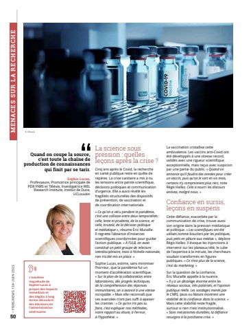 50%u2013 FNRS.NEWS 134-JUIN 2025La science sous pression%u00a0: quelles le%u00e7ons apr%u00e8s la crise ?Cinq ans apr%u00e8s le Covid, la recherche en sant%u00e9 publique reste en qu%u00eate de rep%u00e8res. La crise sanitaire a mis %u00e0 nu les tensions entre parole scientifique, d%u00e9cisions politiques et communication d%u2019urgence. Elle a aussi r%u00e9v%u00e9l%u00e9 les fragilit%u00e9s structurelles des dispositifs de pr%u00e9vention, de vaccination et de%u00a0coordination internationale.%u00ab%u00a0Ce qu%u2019on a v%u00e9cu pendant la pand%u00e9mie, c%u2019est une collision entre deux temporalit%u00e9s%u00a0: celle, lente et prudente, de la science, et celle, brutale, de la d%u00e9cision politique et m%u00e9diatique%u00a0%u00bb, r%u00e9sume %u00c9ric Muraille. Il regrette l%u2019absence d%u2019instances scientifiques coordonn%u00e9es pour guider l%u2019action publique. %u00ab%u00a0%u00c0 l%u2019ULB, on avait constitu%u00e9 un petit groupe de relecture interdisciplinaire, mais %u00e0 l%u2019%u00e9chelle nationale, rien n%u2019a %u00e9t%u00e9 mis en place.%u00a0%u00bbSophie Lucas, estime, sans minimiser l%u2019horreur, que la pand%u00e9mie fut un moment d%u2019acc%u00e9l%u00e9ration scientifique. %u00ab%u00a0Sur le plan de la collaboration entre laboratoires, des progr%u00e8s techniques, de la%u00a0compr%u00e9hension des r%u00e9ponses immunitaires, on a avanc%u00e9 %u00e0 une vitesse incroyable.%u00a0%u00bb Mais%u00a0elle reconna%u00eet que ces%u00a0avanc%u00e9es n%u2019ont pas suffi %u00e0 apaiser les%u00a0craintes%u00a0: %u00ab%u00a0Ce qu%u2019on n%u2019a pas su faire, c%u2019est expliquer nos m%u00e9thodes, notre rapport au doute, %u00e0%u00a0l%u2019erreur, %u00e0%u00a0l%u2019hypoth%u00e8se.%u00a0%u00bbLa vaccination cristallise cette ambivalence. Les vaccins anti-Covid ont %u00e9t%u00e9 d%u00e9velopp%u00e9s %u00e0 une vitesse record, valid%u00e9s avec une rigueur scientifique exceptionnelle, mais re%u00e7us avec suspicion par une partie du public. %u00ab%u00a0Quand on annonce qu%u2019il faudra des ann%u00e9es pour cr%u00e9er un vaccin, puis qu%u2019on le sort en six mois, certains n%u2019y comprennent plus rien, note R%u00e9gis Hallez. Cela a nourri les discours antivax, malgr%u00e9 nous.%u00a0%u00bbConfiance en sursis, le%u00e7ons en suspensCette d%u00e9fiance, exacerb%u00e9e par la communication de crise, trouve aussi son origine dans la pression m%u00e9diatique et politique. %u00ab%u00a0Les scientifiques ont %u00e9t%u00e9 utilis%u00e9s comme boucliers par les politiques, puis jet%u00e9s en p%u00e2ture aux m%u00e9dias%u00a0%u00bb, d%u00e9plore R%u00e9gis Hallez. Il %u00e9voque les injonctions %u00e0 intervenir sur les plateaux t%u00e9l%u00e9, le culte de l%u2019expertise %u00e0 la minute, les chercheurs soudain transform%u00e9s en figures publiques. %u00ab%u00a0Ce n%u2019est plus de la science, c%u2019est du marketing.%u00a0%u00bbSur la question de la confiance, %u00c9ric Muraille appelle %u00e0 la nuance. %u00ab%u00a0Il y a un d%u00e9calage %u00e9norme entre les r%u00e9seaux sociaux, tr%u00e8s polaris%u00e9s, et l%u2019opinion publique r%u00e9elle. Les sondages men%u00e9s par le CNRS, Ipsos ou Nature montrent une stabilit%u00e9 de la confiance dans la science.%u00a0%u00bbMais cette stabilit%u00e9 reste fragile, surtout si rien n%u2019est institutionnalis%u00e9. %u00ab%u00a0Sans m%u00e9canismes durables, la d%u00e9fiance resurgira %u00e0 la prochaine crise.%u00a0%u00bbQuand on coupe la source, c%u2019est toute la cha%u00eene de production de connaissances qui finit par se tarir. Sophie Lucas, Professeure, Promotrice principale de PDR%u00a0FNRS et T%u00e9l%u00e9vie, Investigatrice WEL Research Institute, Institut de Duve, UCLouvainL%u2019extr%u00eame inqui%u00e9tude de Sophie Lucas %u00e0 propos des impacts imm%u00e9diats et des d%u00e9g%u00e2ts %u00e0 long terme d%u00e9coulant des d%u00e9cisions de l%u2019administration am%u00e9ricaine.MENACES SUR LA RECHERCHE%u00a9 iStock