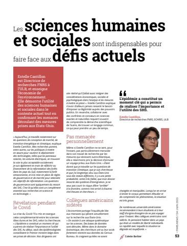 53%u2013 FNRS.NEWS 134-JUIN 2025%u00ab%u00a0Aujourd%u2019hui, je travaille notamment sur les questions de conception de march%u00e9, de transition %u00e9nerg%u00e9tique et climatique, explique Estelle Cantillon. Mes recherches portent, entre autres, sur les politiques %u00e0 mettre en%u00a0%u0153uvre pour soutenir le d%u00e9ploiement des%u00a0technologies, telles que les panneaux solaires, les voitures %u00e9lectriques, en trouvant la%u00a0voie la%u00a0plus acceptable socialement. Je suis %u00e9galement en train de r%u00e9fl%u00e9chir au financement de la reforestation des for%u00eats dans les pays du Sud, notamment la for%u00eat amazonienne, et%u00a0%u00e0%u00a0la mise en place de r%u00e8gles de gouvernance et de march%u00e9 pour atteindre ces objectifs de%u00a0reforestation. Les questions de%u00a0gouvernance sont typiquement du ressort des SHS. C%u2019est l%u00e0 qu%u2019elles sont un compl%u00e9ment essentiel aux recherches en science et en%u00a0technologie.%u00a0%u00bbR%u00e9v%u00e9lation pendant le%u00a0CovidLa crise du Covid-19 a mis en exergue cette compl%u00e9mentarit%u00e9 entre les sciences dites dures et les SHS, selon la chercheuse. %u00ab%u00a0L%u2019%u00e9pid%u00e9mie a constitu%u00e9 un moment cl%u00e9 qui a permis de r%u00e9aliser l%u2019importance et l%u2019utilit%u00e9 des SHS. Au d%u00e9but, seuls des %u00e9pid%u00e9miologistes conseillaient le Premier ministre belge dans ses prises de d%u00e9cision. Nos dirigeants ont vite r%u00e9alis%u00e9 qu%u2019il fallait aussi int%u00e9grer des consid%u00e9rations %u00e9conomiques, sociales et psychologiques dans l%u2019analyse et les mesures %u00e0%u00a0mettre en place%u00a0%u00bb. Estelle Cantillon explique n%u2019avoir d%u2019ailleurs jamais ressenti le besoin d%u2019imposer sa l%u00e9gitimit%u00e9 aupr%u00e8s des pouvoirs publics. En revanche, collaborer avec des confr%u00e8res et cons%u0153urs en sciences exactes et naturelles requiert souvent de%u00a0comprendre la d%u00e9marche scientifique de%u00a0l%u2019autre, de trouver un langage commun, ce qui peut prendre un peu de temps. Pas menac%u00e9e personnellementM%u00eame si Estelle Cantillon ne se sent, pour l%u2019instant, pas particuli%u00e8rement menac%u00e9e dans son travail de recherche par les mesures qui s%u00e9vissent outre-Atlantique, elle%u00a0a n%u00e9anmoins pris la d%u00e9cision d%u2019annuler un voyage pr%u00e9vu aux %u00c9tats-Unis. %u00ab%u00a0%u00c9tant donn%u00e9 que je travaille sur les questions de transition climatique, que je suis chercheuse et%u00a0que j%u2019ai longtemps v%u00e9cu aux %u00c9tats-Unis sous des statuts diff%u00e9rents, il y a une petite probabilit%u00e9, certes tr%u00e8s faible, que mon dossier ressorte des syst%u00e8mes d%u2019immigration. Je ne veux pas courir le risque d%u2019%u00eatre %u2018%u2019arr%u00eat%u00e9e%u2019%u2019 %u00e0%u00a0la fronti%u00e8re, comme c%u2019est arriv%u00e9 %u00e0 d%u2019autres chercheuses et chercheurs.%u00a0%u00bbColl%u00e8gues am%u00e9ricains sid%u00e9r%u00e9sL%u2019%u00e9conomiste partage l%u2019inqui%u00e9tude li%u00e9e aux menaces qui p%u00e8sent actuellement sur la recherche aux %u00c9tats-Unis. %u00ab%u00a0On%u00a0assiste%u00a0%u00e0%u00a0une%u00a0attaque syst%u00e9matique sur les sciences. Des%u00a0bases de donn%u00e9es sont d%u00e9truites. M%u00eame%u00a0dans le domaine %u00e9conomique, des chercheurs ont vu leur acc%u00e8s fortement restreint aux donn%u00e9es du%u00a0Census Bureau. Ils craignent qu%u2019elles ne soient chang%u00e9es et%u00a0manipul%u00e9es. Lorsqu%u2019on en arrive %u00e0 limiter le%u00a0corpus permettant d%u2019%u00e9tudier et de%u00a0comprendre les ph%u00e9nom%u00e8nes, la situation est tr%u00e8s grave.De nombreuses universit%u00e9s am%u00e9ricaines recommandent %u00e0 leurs %u00e9tudiants et %u00e0 leur staff d%u2019origine %u00e9trang%u00e8re de ne pas voyager pour l%u2019instant. Mes coll%u00e8gues am%u00e9ricains sont sid%u00e9r%u00e9s. Ils pensaient habiter dans un pays qui %u00e9tait un mod%u00e8le de libert%u00e9 individuelle. La%u00a0rapidit%u00e9 avec laquelle la situation se d%u00e9grade est stup%u00e9fiante.%u00a0%u00bb Colette BarbierLes sciences humaines et sociales sont indispensables pour faire face aux d%u00e9fis actuelsL%u2019%u00e9pid%u00e9mie a constitu%u00e9 un moment cl%u00e9 qui a permis de r%u00e9aliser l%u2019importance et l%u2019utilit%u00e9 des SHS.Estelle Cantillon, Directrice de recherches FNRS, ECARES, ULBEstelle Cantillon est Directrice de recherches FNRS %u00e0 l%u2019ULB, et enseigne l%u2019%u00e9conomie de l%u2019environnement. Elle%u00a0d%u00e9montre l%u2019utilit%u00e9 des sciences humaines et sociales dans le contexte actuel tout en confirmant les%u00a0menaces d%u00e9coulant des mesures prises aux %u00c9tats-Unis.