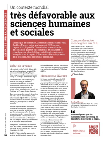 54%u2013 FNRS.NEWS 134-JUIN 2025Sociologue de formation, Directeur de recherches FNRS, Geoffrey Pleyers m%u00e8ne ses travaux %u00e0 l%u2019UCLouvain. Depuis 2023, il pr%u00e9side l%u2019Association internationale de sociologie qui met en contact des chercheuses et chercheurs de plus de 80 pays et d%u00e9fend ces derniers lorsqu%u2019ils sont attaqu%u00e9s. Il dresse un tableau inqui%u00e9tant de la situation, tous continents confondus.Un contexte mondialtr%u00e8s d%u00e9favorable aux sciences humaines et socialesD%u00e9but de la vague%u00ab%u00a0Le contexte g%u00e9n%u00e9ral est tr%u00e8s d%u00e9favorable aux sciences humaines et sociales (SHS), annonce d%u2019embl%u00e9e Geoffrey Pleyers. Nous%u00a0craignons que les mesures prises par Trump ne soient que le d%u00e9but de la vague. La situation varie beaucoup d%u2019un pays %u00e0%u00a0l%u2019autre. En Chine, j%u2019ai constat%u00e9 le contraste entre de jeunes sociologues dynamiques et passionnants, et des organisations professionnelles qui encadrent une%u00a0sociologie moins ouverte sur l%u2019ext%u00e9rieur%u00a0qu%u2019il y a une dizaine d%u2019ann%u00e9es.Dans le monde arabe, malgr%u00e9 le dynamisme des SHS %u00e0 la suite des r%u00e9volutions, il est d%u00e9sormais tr%u00e8s difficile d%u2019%u00eatre un chercheur ou une chercheuse en SHS dans la plupart de ces pays, %u00e0 l%u2019exception du Maroc et du%u00a0Liban.En Inde, le gouvernement nationaliste nomme des responsables politiques pour superviser et contr%u00f4ler les SHS, alors que des sociologues proches du r%u00e9gime occupent un nombre croissant de postes %u00e0 responsabilit%u00e9s. Certains chercheurs et chercheuses continuent %u00e0 y d%u00e9velopper des%u00a0SHS critiques, mais au prix de menaces et de limitations dans leur carri%u00e8re. En Argentine, comme dans de nombreux pays, le pr%u00e9sident ultralib%u00e9ral Milei a tent%u00e9 de couper les fonds allou%u00e9s au CONACYT, l%u2019%u00e9quivalent du FNRS.En 2019, l%u2019Universit%u00e9 d%u2019Europe centrale, ax%u00e9e sur les SHS, a clos la plupart de ses activit%u00e9s %u00e0 Budapest suite aux pressions de Victor Orban, qui la jugeait trop critique et trop proche de ce qu%u2019il appelle %u2018%u2019l%u2019id%u00e9ologie LGBT%u2019%u2019.%u00a0%u00bb Menaces sur l%u2019EuropeEn Europe occidentale aussi, les SHS sont menac%u00e9es. %u00ab%u00a0Y compris dans les pays qui repr%u00e9sentaient jusqu%u2019il y a peu les d%u00e9mocraties les plus solides, o%u00f9 l%u2019%u00c9tat de droit n%u2019%u00e9tait pas contest%u00e9, o%u00f9 les chercheurs et chercheuses b%u00e9n%u00e9ficiaient d%u2019une grande libert%u00e9. En 2024, plus de 500 chercheurs bas%u00e9s en Suisse ont sign%u00e9 une p%u00e9tition d%u00e9non%u00e7ant les attaques de l%u2019administration et de la presse contre des centres de recherche sur le genre. En Allemagne, la ministre f%u00e9d%u00e9rale de la Recherche a demand%u00e9 de sanctionner des professeurs qui d%u00e9non%u00e7aient la violence polici%u00e8re contre les %u00e9tudiants. Les chercheuses renomm%u00e9es, Judith Butler et Nancy Fraser, ont vu leurs conf%u00e9rences annul%u00e9es parce qu%u2019elles osaient aborder la question de la guerre en%u00a0Palestine et la notion de g%u00e9nocide. Elles%u00a0ont %u00e9t%u00e9 accus%u00e9es d%u2019antis%u00e9mitisme, alors qu%u2019elles sont toutes deux d%u2019origine juive !En France, le financement des SHS a consid%u00e9rablement diminu%u00e9 et le gouvernement a activement particip%u00e9 %u00e0 des campagnes les d%u00e9cr%u00e9dibilisant. En 2021, le ministre de l%u2019%u00c9ducation a exig%u00e9 que les chercheurs et chercheuses n%u2019utilisent plus le concept %u2018%u2018d%u2019intersectionnalit%u00e9%u2019%u2019, pourtant essentiel dans les sciences sociales contemporaines.%u00a0%u00bbComprendre notre monde gr%u00e2ce aux SHSFace %u00e0 cette crise et %u00e0 la p%u00e9riode de mutation que nous traversons, %u00ab%u00a0comprendre le monde, se baser sur des donn%u00e9es solides et des analyses de la recherche est encore plus essentiel ! conclut Geoffrey Pleyers. Il est primordial de pouvoir distinguer les %u00e9volutions structurelles des informations de court terme, de ne pas perdre de vue les grands d%u00e9fis de notre si%u00e8cle%u00a0: vivre ensemble sur une plan%u00e8te limit%u00e9e, d%u00e9fendre la d%u00e9mocratie, former des citoyens et citoyennes capables d%u2019avoir un point de vue critique face %u00e0 la d%u00e9sinformation.%u00a0%u00bb Colette BarbierGeoffrey Pleyers,Directeur de recherches FNRS, IACS-CriDIS, UCLouvain et Pr%u00e9sident de l%u2019International Sociological AssociationNous craignons que les mesures prises par Trump ne soient que le d%u00e9but de la%u00a0vague. MENACES SUR LA RECHERCHEGeoffrey Pleyers %u00e0 propos de la libert%u00e9 de chercher.