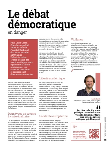 55%u2013 FNRS.NEWS 134-JUIN 2025Pour Louis Carr%u00e9, Chercheur qualifi%u00e9 FNRS au sein de l%u2019institut Esphin et du Centre Arcadie %u00e0 l%u2019UNamur, l%u2019administration Trump attaque des savoirs critiques mais %u00e9galement la libert%u00e9 acad%u00e9mique. Les sciences humaines et sociales sont directement menac%u00e9es. Le d%u00e9bat d%u00e9mocratiqueen dangerSelon le chercheur sp%u00e9cialis%u00e9 en philosophie sociale et politique, les menaces et les attaques sur les SHS venant de partis de droite extr%u00eame sont r%u00e9currentes et ne sont pas anodines. %u00ab%u00a0Derri%u00e8re cela, il y a une politique tr%u00e8s volontariste visant %u00e0 supprimer toute une s%u00e9rie de savoirs critiques qui d%u00e9rangent. Cela est d%u00fb au statut particulier de ces savoirs. D%u2019une part, ils sont produits au sein des universit%u00e9s. D%u2019autre part, leur r%u00f4le est de nourrir les d%u00e9bats d%u00e9mocratiques et publics autour d%u2019enjeux sociaux, politiques, %u00e9cologiques.%u00a0%u00bb Deux types de savoirs %u00e0 vis%u00e9e %u00e9galitaireCes attaques sont illustr%u00e9es de mani%u00e8re %u00e9loquente par la politique de Donald Trump, qui vise en particulier deux types de recherches en SHS. %u00ab%u00a0D%u2019un c%u00f4t%u00e9, ce qu%u2019on appelle outre-Atlantique les %u2018%u2018th%u00e9ories critiques de la race%u2019%u2019. De l%u2019autre, les %u2018%u2019%u00e9tudes de genre%u2019%u2019, dont un des postulats est de montrer qu%u2019il y a une construction sociale du genre et qu%u2019il n%u2019y a pas de naturalit%u00e9 toute faite. Or, l%u2019administration Trump a proclam%u00e9 d%u00e9but 2025 qu%u2019il n%u2019existait naturellement que deux genres%u00a0: les hommes et les femmes. Donc, en contestant la construction sociale des genres, on renaturalise le partage homme-femme, tout en remettant en question les politiques %u00e9galitaristes en%u00a0mati%u00e8re de genre et de race. Certains mots cl%u00e9s, tels que %u2018%u2018genre%u2019%u2019, %u2018%u2018diversit%u00e9%u2019%u2019, %u2018%u2018sant%u00e9 mentale%u2019%u2019, %u2018%u2018sciences climatiques%u2019%u2019 sont d%u00e9sormais bannis dans la recherche. C%u2019est quand m%u00eame fort ! Cela signifie que l%u2019on tord la possibilit%u00e9 de d%u00e9battre d%u00e9mocratiquement sur toute une s%u00e9rie de choses.%u00a0%u00bb Or, cette ouverture au d%u00e9bat d%u00e9mocratique fait partie de l%u2019essence m%u00eame des SHS, qui se voient donc priv%u00e9es de l%u2019une de leurs raisons d%u2019%u00eatre. Libert%u00e9 acad%u00e9mique En censurant certains champs de recherche, en SHS notamment, l%u2019administration Trump attaque la libert%u00e9 acad%u00e9mique. %u00ab%u00a0Selon Trump et ses acolytes, les savoirs produits au sein des universit%u00e9s ont une sorte d%u2019agenda cach%u00e9 dont le but serait d%u2019endoctriner les %u00e9tudiants et %u00e9tudiantes pour les convertir %u00e0 une forme de gauchisme et de marxisme. Ces savoirs ne rel%u00e8vent soi-disant pas de la science mais sont consid%u00e9r%u00e9s comme antiam%u00e9ricains et porteurs d%u2019id%u00e9ologies politiques. Cette tendance %u00e0 confondre libert%u00e9 acad%u00e9mique et libert%u00e9 d%u2019expression est %u00e9galement tr%u00e8s dangereuse.%u00a0%u00bb Solidarit%u00e9 europ%u00e9enneFace %u00e0 cette situation, les pays europ%u00e9ens ne restent pas sans rien faire. %u00ab%u00a0Un%u00a0mouvement %u2018%u2018Stand Up for Science%u2019%u2019 est en train de se cr%u00e9er dans les universit%u00e9s europ%u00e9ennes pour accueillir des chercheurs et chercheuses venant des %u00c9tats-Unis et leur permettre de poursuivre leurs recherches dans un cadre plus propice. R%u00e9cemment, l%u2019universit%u00e9 d%u2019Aix-en-Provence, en France, a%u00a0accueilli une quinzaine de chercheuses et%u00a0chercheurs de diff%u00e9rents domaines.%u00a0%u00bbVigilance Le philosophe ne se sent pas actuellement directement touch%u00e9 par de telles menaces dans son travail de recherche. %u00ab%u00a0Je pense cependant qu%u2019il faut rester vigilant, notamment par rapport aux savoirs critiques li%u00e9s %u00e0 la question du racisme et de l%u2019%u00e9galit%u00e9 de genre, car ils peuvent faire l%u2019objet d%u2019attaques similaires de la part de certains partis politiques en Europe aussi, comme le montrent les campagnes %u2018%u2018anti-wokes%u2019%u2019 et les tentatives d%u2019imposer la r%u00e9%u00e9criture de l%u2019histoire coloniale et postcoloniale.%u00a0%u00bb Colette BarbierLouis Carr%u00e9, Chercheur qualifi%u00e9 FNRS, Institut Esphin et%u00a0Centre Arcadie, UNamurDerri%u00e8re cela, il y a une politique tr%u00e8s volontariste visant %u00e0 supprimer toute une%u00a0s%u00e9rie de savoirs critiques qui d%u00e9rangent.L%u2019analyse de Louis Carr%u00e9 sur le rapport entre le champ des savoirs scientifiques et le pouvoir politique.