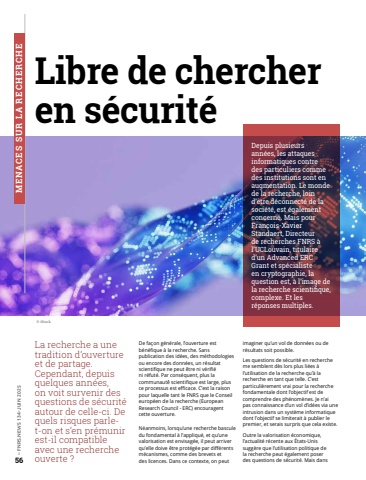 56%u2013 FNRS.NEWS 134-JUIN 2025Depuis plusieurs ann%u00e9es, les attaques informatiques contre des particuliers comme des institutions sont en augmentation. Le monde de la recherche, loin d%u2019%u00eatre d%u00e9connect%u00e9 de la soci%u00e9t%u00e9, est %u00e9galement concern%u00e9. Mais pour Fran%u00e7ois-Xavier Standaert, Directeur de recherches FNRS %u00e0 l%u2019UCLouvain, titulaire d%u2019un Advanced ERC Grant et sp%u00e9cialiste en cryptographie, la question est, %u00e0 l%u2019image de la recherche scientifique, complexe. Et les r%u00e9ponses multiples.Libre de chercheren s%u00e9curit%u00e9La recherche a une tradition d%u2019ouverture et de partage. Cependant, depuis quelques ann%u00e9es, on voit survenir des questions de s%u00e9curit%u00e9 autour de celle-ci. De quels risques parlet-on et s%u2019en pr%u00e9munir est-il compatible avec une recherche ouverte ?De fa%u00e7on g%u00e9n%u00e9rale, l%u2019ouverture est b%u00e9n%u00e9fique %u00e0 la recherche. Sans publication des id%u00e9es, des m%u00e9thodologies ou encore des donn%u00e9es, un r%u00e9sultat scientifique ne peut %u00eatre ni v%u00e9rifi%u00e9 ni r%u00e9fut%u00e9. Par cons%u00e9quent, plus la communaut%u00e9%u0301 scientifique est large, plus ce processus est efficace. C%u2019est la raison pour laquelle tant le FNRS que le Conseil europ%u00e9en de la recherche (European Research Council - ERC) encouragent cette ouverture.N%u00e9anmoins, lorsqu%u2019une recherche bascule du fondamental %u00e0 l%u2019appliqu%u00e9, et qu%u2019une valorisation est envisag%u00e9e, il peut arriver qu%u2019elle doive %u00eatre prot%u00e9g%u00e9e par diff%u00e9rents m%u00e9canismes, comme des brevets et des licences. Dans ce contexte, on peut imaginer qu%u2019un vol de donn%u00e9es ou de r%u00e9sultats soit possible.Les questions de s%u00e9curit%u00e9 en recherche me semblent d%u00e8s lors plus li%u00e9es %u00e0 l%u2019utilisation de la recherche qu%u2019%u00e0 la recherche en tant que telle. C%u2019est particuli%u00e8rement vrai pour la recherche fondamentale dont l%u2019objectif est de comprendre des ph%u00e9nom%u00e8nes. Je n%u2019ai pas connaissance d%u2019un vol d%u2019id%u00e9es via une intrusion dans un syst%u00e8me informatique dont l%u2019objectif se limiterait %u00e0 publier le premier, et serais surpris que cela existe.Outre la valorisation %u00e9conomique, l%u2019actualit%u00e9 r%u00e9cente aux %u00c9tats-Unis sugg%u00e8re que l%u2019utilisation politique de la recherche peut %u00e9galement poser des questions de s%u00e9curit%u00e9. Mais dans %u00a9 iStockMENACES SUR LA RECHERCHE