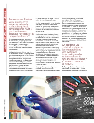 58%u2013 FNRS.NEWS 134-JUIN 2025Pouvez-vous illustrer votre propos avec votre domaine de recherche qu%u2019est la cryptographie ? Est-il particuli%u00e8rement sensible ? Pr%u00e9sente-t-il des particularit%u00e9s ?%u00c0 l%u2019instar de la plupart des technologies de l%u2019information, la cryptographie est une%u00a0technologie %u00ab%u00a0dual-use%u00a0%u00bb. L%u2019%u00e9valuation des risques de %u00ab%u00a0misuse%u00a0%u00bb a donc toujours fait partie de nos r%u00e9flexions lorsque l%u2019on envisage une collaboration internationale.Mis %u00e0 part cette contrainte, et peut-%u00eatre de fa%u00e7on contre-intuitive, la cryptographie est un domaine de recherche o%u00f9 le besoin de transparence est reconnu comme %u00e9tant particuli%u00e8rement indispensable. C%u2019est en effet l%u2019examen minutieux d%u2019une communaut%u00e9 scientifique qui permet d%u2019augmenter la confiance en la s%u00e9curit%u00e9 d%u2019un algorithme cryptographique. Il est int%u00e9ressant de noter que ce principe a %u00e9t%u00e9 formalis%u00e9 par un militaire, Auguste%u00a0Kerckhoffs, d%u00e8s le XIXe si%u00e8cle, et n%u2019a jamais%u00a0%u00e9t%u00e9 remis en cause, %u00e0 tout le moins dans le milieu acad%u00e9mique.De plus, la cryptographie est un domaine dans lequel l%u2019utilisation de brevets et licences est assez limit%u00e9e. Par exemple, l%u2019absence de brevets est souvent une condition n%u00e9cessaire pour standardiser un algorithme.D%u00e8s lors, les risques li%u00e9s %u00e0 la recherche en cryptographie me semblent une fois encore situ%u00e9s du c%u00f4t%u00e9 de son utilisation. %u00c0 ce titre, je mentionnerais surtout les%u00a0tentatives pour r%u00e9duire la s%u00e9curit%u00e9 et%u00a0la vie priv%u00e9e en ligne, que l%u2019on ne peut malheureusement pas imputer %u00e0 des ing%u00e9rences %u00e9trang%u00e8res. En effet, %u00e0 des fins d%u2019enqu%u00eates li%u00e9es au terrorisme, %u00e0 la p%u00e9dophilie ou encore au narcotrafic, plusieurs projets de r%u00e9gulation europ%u00e9ens souhaitent introduire des portes d%u00e9rob%u00e9es, ou des m%u00e9canismes comme le s%u00e9questre des cl%u00e9s de chiffrement et l%u2019analyse automatique des %u00e9changes, connu sous le nom de %u00ab%u00a0client-side scanning%u00a0%u00bb, visant %u00e0 acc%u00e9der %u00e0 aux communications s%u00e9curis%u00e9es par des outils cryptographiques.Ces propositions, syst%u00e9matiquement critiqu%u00e9es par la communaut%u00e9 scientifique, me semblent surtout relever d%u2019une compr%u00e9hension superficielle des enjeux%u00a0: elles ne bloqueront jamais un acteur mal intentionn%u00e9 et seront pr%u00e9judiciables pour les droits fondamentaux d%u2019une majorit%u00e9 de citoyens et citoyennes. En outre, les m%u00e9canismes de surveillance augmentent les risques de vol de secrets industriels, d%u2019interception de n%u00e9gociations politiques en cours, etc. En supposant un monde qui se radicalise, ils pourraient aussi mettre %u00e0 mal la s%u00e9curit%u00e9 des chercheurs et chercheuses travaillant sur des th%u00e9matiques per%u00e7ues comme sensibles, donc r%u00e9duire la libert%u00e9 de chercher.En pratique, un vol de donn%u00e9es via les vuln%u00e9rabilit%u00e9s des syst%u00e8mes informatiques des universit%u00e9s est-il une%u00a0menace cr%u00e9dible%u00a0? Comment mesurer le%u00a0risque ?De fa%u00e7on g%u00e9n%u00e9rale, les risques de vol de donn%u00e9es d%u00e9pendent de la %u00ab%u00a0surface d%u2019attaque%u00a0%u00bb de l%u2019adversaire. En simplifiant, %u00a9 iStockMENACES SUR LA RECHERCHE