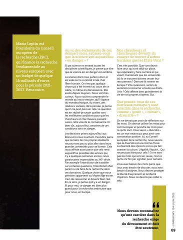 69%u2013 FNRS.NEWS 134-JUIN 2025Au vu des %u00e9v%u00e9nements de ces derniers mois, estimez-vous que la science soit aujourd%u2019hui %u00ab%u00a0en danger%u00a0%u00bb ?Si par science on entend toutes les disciplines scientifiques, je pense que dire que la science est en danger est extr%u00eame. La science dont nous parlons donc ici est ax%u00e9e sur la curiosit%u00e9 inn%u00e9e chez l%u2019%u00eatre humain. Ce n%u2019est pas quelque chose qui a %u00e9t%u00e9 invent%u00e9 au cours de ce si%u00e8cle, ni m%u00eame %u00e0 la Renaissance. Elle existe depuis toujours. Nous sommes curieux. Nous voulons comprendre le monde qui nous entoure, qu%u2019il s%u2019agisse du monde physique, du vivant, des relations sociales, de la pens%u00e9e. Je pense qu%u2019on ne peut pas tuer cela. La question est en r%u00e9alit%u00e9 de savoir quelles sont les meilleures conditions pour que les chercheurs et chercheuses puissent suivre cette voie de la connaissance. Et bien s%u00fbr, aujourd%u2019hui, certaines de ces conditions sont en danger.Les d%u00e9cisions prises aujourd%u2019hui aux %u00c9tats-Unis nous touchent. Peut-%u00eatre parce que certains de nos propres %u00e9tudiants ne pourront pas ou plus aller dans leurs grandes universit%u00e9s pour se former. Cela nous affecte aussi parce que cela rend aujourd%u2019hui possibles des actions qui, il y a quelques semaines encore, nous paraissaient impensables au XXIe si%u00e8cle. Par exemple l%u2019interdiction de travailler sur certaines questions, l%u2019interdiction d%u2019en parler ou de faire de la recherche dans ces domaines. Quelque chose que nous pensions appartenir au Moyen %u00c2ge est en train de ressusciter et devient bien r%u00e9el. En ce sens, je pense qu%u2019il y a un danger. Et%u00a0pour moi, ce danger est bien plus grand pour la recherche am%u00e9ricaine que pour nous, en Europe. Nos chercheurs et chercheuses devront-ils essayer de trouver d%u2019autres horizons que les %u00c9tats-Unis ?C%u2019est tr%u00e8s possible. Que vont devoir faire ceux qui sont d%u00e9j%u00e0 sur place, qui esp%u00e9raient y faire carri%u00e8re et qui voient maintenant que les universit%u00e9s o%u00f9 ils se trouvent doivent cesser leur recrutement%u00a0? Devront-ils revenir en Europe ? S%u2019ils reviennent, seront-ils autoris%u00e9s %u00e0 retourner ensuite aux %u00c9tatsUnis ? Cela affecte donc grandement la vie de nos propres citoyens. Oui. Que pensez-vous de ces nouveaux mots qui y sont interdits dans la recherche, comme %u00ab%u00a0genre%u00a0%u00bb, %u00ab%u00a0climat%u00a0%u00bb, %u00ab%u00a0diversit%u00e9%u00a0%u00bb ?On ne devrait pas avoir de r%u00e9flexions sur les mots. On devrait utiliser les mots pour communiquer et prendre les mots pour ce qu%u2019ils sont. Vous savez, %u00ab%u00a0diversit%u00e9%u00a0%u00bb est un mot neutre qui peut avoir une connotation positive. Ici, au Conseil europ%u00e9en de la recherche, nous savons que la diversit%u00e9 est une bonne chose. La diversit%u00e9 des opinions est ce qui fait avancer la culture. L%u2019%u00e9galit%u00e9, l%u2019%u00e9quit%u00e9%u2026 Qui ne peut pas %u00eatre pour cela ? Ce ne sont pas les mots qui sont en cause, c%u2019est ce qu%u2019ils ont fini par signifier pour certains.Vous avez besoin des mots parce que vous avez besoin de discuter, vous avez besoin d%u2019analyser. Nous devons prot%u00e9ger la libert%u00e9 d%u2019expression et la libert%u00e9 d%u2019opinion. Nous ne devons pas c%u00e9der %u00e0 cela.Nous devons reconna%u00eetrequ%u2019une carri%u00e8re dans la recherche exigedu d%u00e9vouement et doit %u00eatre soutenue. Maria Leptin est Pr%u00e9sidente du Conseil europ%u00e9en de la recherche (ERC), qui finance la recherche fondamentale au niveau europ%u00e9en avec un budget de quelque 16%u00a0milliards d%u2019euros pour la p%u00e9riode 2021-2027. Rencontre.