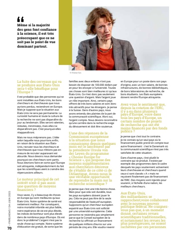 70%u2013 FNRS.NEWS 134-JUIN 2025La fuite des cerveaux qui va se produire aux %u00c9tats-Unis sera-t-elle b%u00e9n%u00e9fique pour l%u2019Europe ?Il est probable que des personnes qui se sont install%u00e9es aux %u00c9tats-Unis, les bons chercheurs et chercheuses que nous aurions perdus, reviendront en Europe. Mais je suppose que la situation aux %u00c9tats-Unis ne sera pas permanente. La curiosit%u00e9 humaine et toute la culture de la recherche ne vont pas dispara%u00eetre du jour au lendemain. Elles seront ralenties, r%u00e9duites, minimis%u00e9es, mais elles ne dispara%u00eetront pas. C%u2019est pourquoi elles r%u00e9appara%u00eetront. Mais ne nous m%u00e9prenons pas. L%u2019id%u00e9e selon laquelle nous pourrions enfin, en raison de la situation aux %u00c9tatsUnis, recruter tous les chercheurs et chercheuses que nous n%u2019%u00e9tions pas en mesure de recruter auparavant est absurde. Nous devons nous demander pourquoi ces chercheurs sont partis. Nous devrions faire en sorte que l%u2019Europe soit attrayante, ind%u00e9pendamment du fait que les scientifiques aient %u00e0 craindre des r%u00e9percussions ailleurs.Le moteur principal de cet int%u00e9r%u00eat n%u2019est-il pas aussi une question de moyens financiers ?Vous savez, il y a beaucoup de choses en Europe qui sont meilleures qu%u2019aux %u00c9tats-Unis. Notre syst%u00e8me de sant%u00e9 est nettement meilleur. Par cons%u00e9quent, notre mortalit%u00e9 infantile est plus faible, notre esp%u00e9rance de vie est plus %u00e9lev%u00e9e, les indices de bonheur sont plus %u00e9lev%u00e9s dans de nombreux pays d%u2019Europe. O%u00f9 est donc le probl%u00e8me? L%u2019argent n%u2019est pas la seule chose qui compte. Notre syst%u00e8me d%u2019%u00e9ducation est gratuit, de sorte que les familles avec deux enfants n%u2019ont pas besoin de disposer de 100.000 dollars par an pour les envoyer %u00e0 l%u2019universit%u00e9. Toutes ces choses sont bien meilleures ici qu%u2019aux %u00c9tats-Unis. Ce n%u2019est donc pas seulement une question d%u2019argent. Mais l%u2019argent joue un r%u00f4le important. Ainsi, certains pays offrent de tr%u00e8s bons salaires et sont donc tr%u00e8s attractifs pour les %u00e9trangers. Je pense %u00e0 la Suisse. Dans d%u2019autres pays, nous avons entendu des plaintes de la part de la communaut%u00e9 scientifique. Alors oui, l%u2019argent compte. Nous devons reconna%u00eetre qu%u2019une carri%u00e8re dans la recherche exige du d%u00e9vouement et doit %u00eatre soutenue.L%u2019une des r%u00e9ponses de la Commission europ%u00e9enne %u00e0 la situation que nous connaissons depuis quelques mois est le lancement par la pr%u00e9sidente Ursula von der Leyen du programme %u00ab%u00a0Choose Europe for Science%u00a0%u00bb, qui propose des moyens suppl%u00e9mentaires aux chercheurs d%u00e9sireux de s%u2019%u00e9tablir de ce c%u00f4t%u00e9-ci de l%u2019Atlantique. Avons-nous l%u00e0 une v%u00e9ritable opportunit%u00e9 de reprendre la main sur la recherche scientifique ?Je pense que c%u2019est une tr%u00e8s bonne chose. Mais pour que cela soit durable, tous les pays europ%u00e9ens doivent jouer le jeu. Cela ne peut pas %u00eatre de la seule responsabilit%u00e9 de l%u2019ex%u00e9cutif europ%u00e9en. Supposons qu%u2019un chercheur europ%u00e9en expatri%u00e9 aux %u00c9tats-Unis soit sollicit%u00e9 par une universit%u00e9 europ%u00e9enne. Cette personne ne reviendra pas simplement parce que le Conseil europ%u00e9en de la recherche lui offrirait un financement de quelques millions d%u2019euros sur une p%u00e9riode de cinq ans. Elle voudra revenir en Europe pour un poste dans son pays d%u2019origine, avec un bon salaire, de bonnes infrastructures, de bonnes biblioth%u00e8ques, de bons laboratoires de recherche, de bons %u00e9tudiants. Les %u00c9tats europ%u00e9ens doivent rendre l%u2019Europe attrayante. Avez-vous le sentiment que, depuis la cr%u00e9ation de l%u2019ERC, il y a eu dans plusieurs pays d%u2019Europe, voire dans tous les pays d%u2019Europe, un certain nombre de projets de recherche qui ont %u00e9t%u00e9 moins financ%u00e9s par des fonds publics ?Je pense que c%u2019est tout le contraire. Je ne connais qu%u2019un seul pays o%u00f9 le financement public prend en compte tout autre financement%u00a0: c%u2019est le Danemark o%u00f9 la communaut%u00e9 scientifique n%u2019est pas tr%u00e8s satisfaite de cette situation. Dans d%u2019autres pays, c%u2019est plut%u00f4t le contraire qui se produit. Il existe par exemple des programmes dans le cadre desquels les pays soutiennent activement leurs chercheuses et chercheurs quand ceux-ci sont class%u00e9s %u00ab%u00a0A%u00a0%u00bb mais ne re%u00e7oivent finalement pas de financement de l%u2019ERC. Des moyens sont inject%u00e9s pour soutenir, %u00e0 l%u2019%u00e9chelle d%u2019une nation, les meilleurs chercheurs. Aux %u00c9tats-Unis, des%u00a0milliardaires se rapprochent,voire collaborent avec le nouveau pouvoir politique f%u00e9d%u00e9ral. Ne craignezvous pas que, %u00e0 un moment donn%u00e9, certaines revues scientifiques traditionnelles, et notamment les revues les plus prestigieuses, ne soient rachet%u00e9es par ces personnes M%u00eame si la majorit%u00e9 des%u00a0gens font confiance %u00e0 la science, il est tr%u00e8s pr%u00e9occupant que ce ne soit pas le point de vue dominant partout.%u00a9 Danny Gys