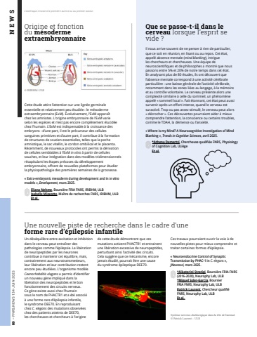 8%u2013 FNRS.NEWS 134-JUIN 2025 NEWSL%u2019ast%u00e9risque renvoie %u00e0 la premi%u00e8re autrice ou au premier auteur.Origine et fonction du m%u00e9soderme extraembryonnaireCette %u00e9tude attire l%u2019attention sur une lign%u00e9e germinale essentielle et relativement peu %u00e9tudi%u00e9e%u00a0: le m%u00e9soderme extraembryonnaire (ExM). %u00c9volutivement, l%u2019ExM appara%u00eet chez les amniotes. L%u2019origine embryonnaire de l%u2019ExM varie selon les esp%u00e8ces et n%u2019est pas encore compl%u00e8tement %u00e9lucid%u00e9e chez l%u2019humain. L%u2019ExM est indispensable %u00e0 la croissance des embryons%u00a0: d%u2019une part, il est le pr%u00e9curseur des cellules sanguines primitives et d%u2019autre part, il contribue %u00e0 la formation de structures de soutien essentielles, telles que la poche amniotique, le sac vitellin, le cordon ombilical et le placenta. R%u00e9cemment, de nouveaux protocoles ont permis la d%u00e9rivation de cellules semblables %u00e0 l%u2019ExM in vitro %u00e0 partir de cellules souches, et leur int%u00e9gration dans des mod%u00e8les tridimensionnels r%u00e9capitulant les %u00e9tapes pr%u00e9coces du d%u00e9veloppement embryonnaire, offrant de nouvelles plateformes pour %u00e9tudier la%u00a0physiopathologie des premi%u00e8res semaines de la grossesse.%u00ab%u00a0Extra-embryonic mesoderm during development and in in vitromodels%u00a0%u00bb, Development, mars 2025.Eliana Nehme, Boursi%u00e8re FRIA%u00a0FNRS, IRIBHM, ULBIsabelle Migeotte, Ma%u00eetre de recherches FNRS, IRIBHM, ULBEt al. Une nouvelle piste de recherche dans le cadre d%u2019uneforme rare d%u2019%u00e9pilepsie infantileUn d%u00e9s%u00e9quilibre entre excitation et inhibition dans le cerveau peut entra%u00eener des pathologies comme l%u2019%u00e9pilepsie. La lib%u00e9ration de neuropeptides par les neurones contribue %u00e0 maintenir cet %u00e9quilibre, mais, contrairement aux neurotransmetteurs, leur lib%u00e9ration et leur contribution restent encore peu %u00e9tudi%u00e9es. L%u2019organisme mod%u00e8le Caenorhabditis elegans a permis d%u2019identifier un nouveau g%u00e8ne impliqu%u00e9 dans la lib%u00e9ration des neuropeptides et le bon fonctionnement des circuits nerveux. Ce g%u00e8ne existe aussi chez l%u2019humain sous%u00a0le nom de PHACTR1 et a %u00e9t%u00e9 associ%u00e9 %u00e0 une forme rare d%u2019%u00e9pilepsie infantile, le%u00a0syndrome DEE70. En reproduisant chez%u00a0C. elegans des mutations observ%u00e9es chez%u00a0des patients atteints de DEE70, les chercheuses et chercheurs %u00e0 l%u2019origine de cette %u00e9tude d%u00e9montrent que ces mutations activent PHACTR1 et entrainent une lib%u00e9ration excessive de neuropeptides, perturbant ainsi l%u2019activit%u00e9 des circuits. Cela sugg%u00e8re que ce m%u00e9canisme, encore jamais %u00e9tudi%u00e9, pourrait %u00eatre une cause du syndrome %u00e9pileptique DEE70.Ces travaux pourraient ouvrir la voie %u00e0 de nouvelles pistes pour mieux comprendre et traiter certaines formes d%u2019%u00e9pilepsie.%u00ab%u00a0Neuroendocrine Control of Synaptic Transmission by PHAC-1 in C. elegans%u00a0%u00bb, JNeurosci, mars 2025.*Aikaterini Stratigi, Boursi%u00e8re FRIA FNRS (2016-2020), Neurophy Lab, ULB*Miguel Soler-Garc%u00eda, Boursier FRIA FNRS, Neurophy Lab, ULBPatrick Laurent, Chercheur qualifi%u00e9 FNRS, Neurophy Lab, ULBEt al. Que se passe-t-il dans le cerveau lorsque l%u2019esprit se vide ?Il nous arrive souvent de ne penser %u00e0 rien de particulier, que%u00a0ce soit en r%u00e9union, en lisant ou au repos. Cet%u00a0%u00e9tat, appel%u00e9 absence mentale (mind blanking), intrigue les chercheurs et chercheuses. Une %u00e9quipe de neuroscientifiques et de philosophes a montr%u00e9 que nous passons entre 5% et 20% de notre temps dans cet %u00e9tat. En%u00a0analysant plus de 80 %u00e9tudes, ils ont d%u00e9couvert que l%u2019absence mentale correspond %u00e0 une activit%u00e9 c%u00e9r%u00e9brale particuli%u00e8re%u00a0: une baisse g%u00e9n%u00e9rale de l%u2019activit%u00e9 c%u00e9r%u00e9brale, notamment dans les zones li%u00e9es au langage, %u00e0 la m%u00e9moire et au contr%u00f4le volontaire. Le%u00a0cerveau pr%u00e9sente alors une complexit%u00e9 similaire %u00e0 celle du sommeil, un ph%u00e9nom%u00e8ne appel%u00e9 %u00ab%u00a0sommeil local%u00a0%u00bb. Fait %u00e9tonnant, cet%u00a0%u00e9tat peut aussi survenir apr%u00e8s un effort intense, quand le%u00a0cerveau est suractiv%u00e9. Trop ou pas assez stimul%u00e9, le cerveau peut alors %u00ab%u00a0d%u00e9crocher%u00a0%u00bb. Ces d%u00e9couvertes pourraient aider %u00e0 mieux comprendre l%u2019attention, la conscience ou certains troubles, comme le TDAH, la d%u00e9mence ou l%u2019anxi%u00e9t%u00e9. %u00ab%u00a0Where is my Mind? A Neurocognitive Investigation of Mind Blanking%u00a0%u00bb, Trends in Cognitive Sciences, avril 2025.*Athena Demertzi, Chercheuse qualifi%u00e9e FNRS, Physiology of Cognition Lab, ULi%u00e8ge Et al.%u00a9 IRIBHM-ULBSyst%u00e8me nerveux cholinergique dans la t%u00eate de l%u2019animal. %u00a9 Patrick Laurent %u2013 ULB