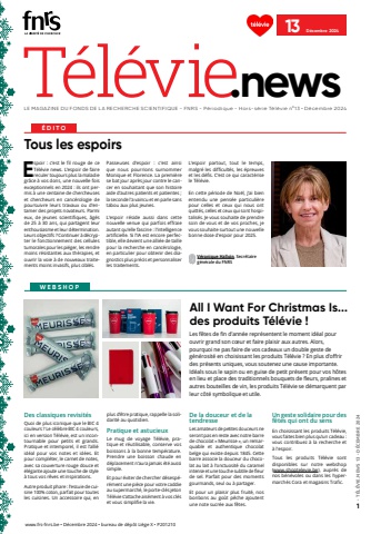 - T%u00c9L%u00c9VIE.NEWS 13 - D%u00c9CEMBRE 20241T%u00e9l%u00e9vieLE MAGAZINE DU FONDS DE LA RECHERCHE SCIENTIFIQUE - FNRS - P%u00e9riodique - Hors-s%u00e9rie T%u00e9l%u00e9vie n%u00b013 %u2022 D%u00e9cembre 2024.newswww.frs-fnrs.be %u2022 D%u00e9cembre 2024 %u2022 bureau de d%u00e9p%u00f4t Li%u00e8ge X %u2022 P20121013 D%u00e9cembre 2024%u00c9DITOTous les espoirs Espoir : c%u2019est le fil rouge de ce T%u00e9l%u00e9vie news. L%u2019espoir de faire reculer toujours plus la maladie gr%u00e2ce %u00e0 vos dons, une nouvelle fois exceptionnels en 2024 : ils ont permis %u00e0 une centaine de chercheuses et chercheurs en canc%u00e9rologie de poursuivre leurs travaux ou d%u2019entamer des projets novateurs. Parmi eux, de jeunes scientifiques, %u00e2g%u00e9s de 25 %u00e0 30 ans, qui partagent leur enthousiasme et leur d%u00e9termination. Leurs objectifs ? Continuer %u00e0 d%u00e9crypter le fonctionnement des cellules tumorales pour les pi%u00e9ger, les rendre moins r%u00e9sistantes aux th%u00e9rapies, et ouvrir la voie %u00e0 de nouveaux traitements moins invasifs, plus cibl%u00e9s.Passeuses d%u2019espoir : c%u2019est ainsi que nous pourrions surnommer Monique et Florence. La premi%u00e8re se bat jour apr%u00e8s jour contre le cancer en souhaitant que son histoire aide d%u2019autres patients et patientes ; la seconde l%u2019a vaincu et en parle sans tabou aux plus jeunes. L%u2019espoir r%u00e9side aussi dans cette nouvelle venue qui parfois effraie autant qu%u2019elle fascine : l%u2019intelligence artificielle. Si l%u2019IA est encore perfectible, elle devient une alli%u00e9e de taille pour la recherche en canc%u00e9rologie, en particulier pour obtenir des diagnostics plus pr%u00e9cis et personnaliser les traitements. L%u2019espoir partout, tout le temps, malgr%u00e9 les difficult%u00e9s, les %u00e9preuves et les d%u00e9fis. C%u2019est ce qui caract%u00e9rise le T%u00e9l%u00e9vie.En cette p%u00e9riode de No%u00ebl, j%u2019ai bien entendu une pens%u00e9e particuli%u00e8re pour celles et ceux qui nous ont quitt%u00e9s, celles et ceux qui sont hospitalis%u00e9s. Je vous souhaite de prendre soin de vous et de vos proches, je vous souhaite surtout une nouvelle bonne dose d%u2019espoir pour 2025.V%u00e9ronique Halloin, Secr%u00e9taire g%u00e9n%u00e9rale du FNRSDes classiques revisit%u00e9s Quoi de plus iconique que le BIC 4 couleurs ? Le c%u00e9l%u00e8bre BIC 4 couleurs, ici en version T%u00e9l%u00e9vie, est un incontournable pour petits et grands. Pratique et intemporel, il est l%u2019alli%u00e9 id%u00e9al pour vos notes et id%u00e9es. Et pour compl%u00e9ter, le carnet de notes, avec sa couverture rouge douce et %u00e9l%u00e9gante ajoute une touche de style %u00e0 tous vos r%u00eaves et inspirations.Autre produit phare : l%u2019essuie de cuisine 100% coton, parfait pour toutes les cuisines. Un accessoire qui, enplus d%u2019%u00eatre pratique, rappelle la solidarit%u00e9 au quotidien.Pratique et astucieux Le mug de voyage T%u00e9l%u00e9vie, pratique et r%u00e9utilisable, conserve vos boissons %u00e0 la bonne temp%u00e9rature. Prendre une boisson chaude en d%u00e9placement n%u2019aura jamais %u00e9t%u00e9 aussi simple.Et pour %u00e9viter de chercher d%u00e9sesp%u00e9r%u00e9ment une pi%u00e8ce pour votre caddie au supermarch%u00e9, le porte-cl%u00e9s jeton T%u00e9l%u00e9vie s%u2019attache ais%u00e9ment %u00e0 vos cl%u00e9s et vous simplifie la vie.De la douceur et de la tendresse Les amateurs de petites douceurs ne seront pas en reste avec notre barre de chocolat %u00ab Meurisse %u00bb, un remarquable et authentique chocolat belge qui existe depuis 1845. Cette barre associe la douceur du chocolat au lait %u00e0 l'onctuosit%u00e9 du caramel intense et une touche subtile de fleur de sel. Parfait pour des moments gourmands, seul ou %u00e0 partager.Et pour un plaisir plus fruit%u00e9, nos bonbons au go%u00fbt p%u00eache ajoutent une note sucr%u00e9e aux f%u00eates.Un geste solidaire pour des f%u00eates qui ont du sensEn choisissant les produits T%u00e9l%u00e9vie, vous faites bien plus qu%u2019un cadeau : vous contribuez %u00e0 la recherche et %u00e0 l'espoir.Tous les produits T%u00e9l%u00e9vie sont disponibles sur notre webshop (www.shoptelevie.be), aupr%u00e8s de nos b%u00e9n%u00e9voles ou dans les hypermarch%u00e9s Cora et magasins Trafic.WEBSHOPAll I Want For Christmas Is...des produits T%u00e9l%u00e9vie ! Les f%u00eates de fin d'ann%u00e9e repr%u00e9sentent le moment id%u00e9al pour ouvrir grand son c%u0153ur et faire plaisir aux autres. Alors, pourquoi ne pas faire de vos cadeaux un double geste de g%u00e9n%u00e9rosit%u00e9 en choisissant les produits T%u00e9l%u00e9vie ? En plus d%u2019offrir des pr%u00e9sents uniques, vous soutenez une cause importante. Id%u00e9als sous le sapin ou en guise de petit pr%u00e9sent pour vos h%u00f4tes en lieu et place des traditionnels bouquets de fleurs, pralines et autres bouteilles de vin, les produits T%u00e9l%u00e9vie se d%u00e9marquent par leur c%u00f4t%u00e9 symbolique et utile.
