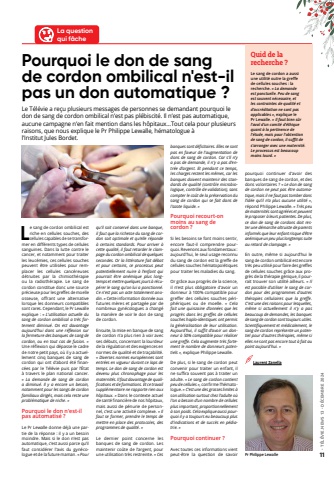 - T%u00c9L%u00c9VIE.NEWS 13 - D%u00c9CEMBRE 202411Pourquoi le don de sangde cordon ombilical n'est-il pas un don automatique ?Le T%u00e9l%u00e9vie a re%u00e7u plusieurs messages de personnes se demandant pourquoi le don de sang de cordon ombilical n%u2019est pas pl%u00e9biscit%u00e9. Il n%u2019est pas automatique, aucune campagne n%u2019en fait mention dans les h%u00f4pitaux%u2026Tout cela pour plusieurs raisons, que nous explique le Pr Philippe Lewalle, h%u00e9matologue %u00e0 l%u2019Institut Jules Bordet.L e sang de cordon ombilical est riche en cellules souches, des cellules capables de se transformer en diff%u00e9rents types de cellules sanguines. Dans la lutte contre le cancer, et notamment pour traiter les leuc%u00e9mies, ces cellules souches peuvent %u00eatre utilis%u00e9es pour remplacer les cellules canc%u00e9reuses d%u00e9truites par la chimioth%u00e9rapie ou la radioth%u00e9rapie. Le sang de cordon constitue donc une source pr%u00e9cieuse pour les greffes de moelle osseuse, offrant une alternative lorsque les donneurs compatibles sont rares. Cependant, le Pr Lewalle explique : %u00ab L%u2019utilisation actuelle du sang de cordon ombilical a tr%u00e8s fortement diminu%u00e9. On est davantage aujourd%u2019hui dans une r%u00e9flexion sur la fermeture des banques de sang de cordon, ou en tout cas de fusion. %u00bbUne r%u00e9flexion qui d%u00e9passe le cadre de notre petit pays, o%u00f9 il y a actuellement cinq banques de sang de cordon qui ont d%u2019abord %u00e9t%u00e9 financ%u00e9es par le T%u00e9l%u00e9vie puis par l%u2019%u00c9tat %u00e0 travers le plan national cancer. %u00ab La demande de sang de cordon a diminu%u00e9. Il y a encore un besoin, notamment pour les sangs de cordon familiaux dirig%u00e9s, mais cela reste une probl%u00e9matique de niche. %u00bb Pourquoi le don n'est-il pas automatis%u00e9 ?Le Pr Lewalle donne d%u00e9j%u00e0 une partie de la r%u00e9ponse : il y a un besoin moindre. Mais si le don n%u2019est pas automatique, c%u2019est aussi parce qu%u2019il faut consid%u00e9rer l%u2019avis du gyn%u00e9cologue et de la future maman. %u00ab Pour qu%u2019il soit conserv%u00e9 dans une banque, il faut que la richesse du sang de cordon soit optimale et qu%u2019elle r%u00e9ponde %u00e0 certains standards. Pour arriver %u00e0 cette qualit%u00e9, il faut retarder le clampage du cordon ombilical de quelques secondes. Or la litt%u00e9rature fait d%u00e9bat et pour certains, ce processus peut potentiellement nuire %u00e0 l%u2019enfant qui pourrait %u00eatre an%u00e9mique plus longtemps et mettre quelques jours %u00e0 r%u00e9cup%u00e9rer le sang qu%u2019on lui a ponctionn%u00e9. Ce n%u2019est pas un acte totalement anodin. %u00bb Cette information donn%u00e9e aux futures m%u00e8res et partag%u00e9e par de nombreux gyn%u00e9cologues a chang%u00e9 la mani%u00e8re de voir le don de sang de cordon.Ensuite, la mise en banque de sang de cordon n%u2019a plus rien %u00e0 voir avec ses d%u00e9buts, concernant la lourdeur de la r%u00e9gulation et des exigences en normes de qualit%u00e9 et de tra%u00e7abilit%u00e9. %u00ab Diverses normes europ%u00e9ennes sont entr%u00e9es en vigueur durant ce laps de temps. Le don de sang de cordon est devenu plus chronophage pour les maternit%u00e9s. Il faut davantage de qualifications et de formations. Et ce travail suppl%u00e9mentaire ne rapporte rien aux h%u00f4pitaux. %u00bb Dans le contexte actuel de sant%u00e9 financi%u00e8re de nos h%u00f4pitaux, mais aussi de p%u00e9nurie de personnel, c%u2019est une activit%u00e9 complexe. %u00ab Il faut se former, prendre le temps de mettre en place des protocoles, des programmes de qualit%u00e9. %u00bbLe dernier point concerne les banques de sang de cordon. Les maintenir co%u00fbte de l%u2019argent, pour une utilisation tr%u00e8s restreinte. %u00ab Ces banques sont d%u00e9ficitaires. Elles ne sont pas en faveur de l%u2019augmentation de dons de sang de cordon. Car s%u2019il n%u2019y a pas de demande, il n%u2019y a pas d%u2019entr%u00e9e d%u2019argent. Et pendant ce temps, les charges restent les m%u00eames, car les banques doivent maintenir des standards de qualit%u00e9 (contr%u00f4le microbiologique, contr%u00f4le de validation), sans compter le co%u00fbt de la pr%u00e9servation du sang de cordon qui se fait dans de l%u2019azote liquide. %u00bb Pourquoi recourt-on moins au sang de cordon%u2009?Si les besoins se font moins sentir, encore faut-il comprendre pourquoi. Revenons aux fondamentaux : aujourd'hui, le seul usage reconnu du sang de cordon est la greffe de cellules souches h%u00e9matopo%u00ef%u00e9tiques pour traiter les maladies du sang.Or gr%u00e2ce aux progr%u00e8s de la science, il n%u2019est plus obligatoire d%u2019avoir un donneur %u00e0 100% compatible pour greffer des cellules souches p%u00e9riph%u00e9riques ou de moelle. %u00ab Cela fait une quinzaine d%u2019ann%u00e9es que les progr%u00e8s dans les greffes de cellules souches haplo-identiques ont permis la g%u00e9n%u00e9ralisation de leur utilisation. Aujourd%u2019hui, il suffit d%u2019avoir un donneur %u00e0 50% compatible pour r%u00e9aliser une greffe. Cela augmente tr%u00e8s fortement le nombre de donneurs potentiels %u00bb, explique Philippe Lewalle.De plus, si le sang de cordon peut convenir pour traiter un enfant, il ne suffira souvent pas %u00e0 traiter un adulte. %u00ab Le sang de cordon contient peu de cellules %u00bb, confirme l%u2019h%u00e9matologue. %u00ab C%u2019est une des grosses limites %u00e0 son utilisation surtout chez l%u2019adulte o%u00f9 l%u2019on a besoin d%u2019un nombre de cellules plus important, proportionnellement %u00e0 son poids. Cela explique aussi pourquoi il y a toujours eu beaucoup plus d'indications et de succ%u00e8s en p%u00e9diatrie. %u00bbPourquoi continuer ?Avec toutes ces informations vient peut-%u00eatre la question de savoir pourquoi continuer d%u2019avoir des banques de sang de cordon, et des dons volontaires ? %u00ab Le don de sang de cordon ne peut pas %u00eatre automatique, mais il ne faut pas tom