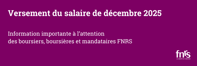 23 décembre 2025Comme chaque année, les salaires des boursiers, boursières et mandataires FNRS de ce mois de décembre seront versés le premier jour...