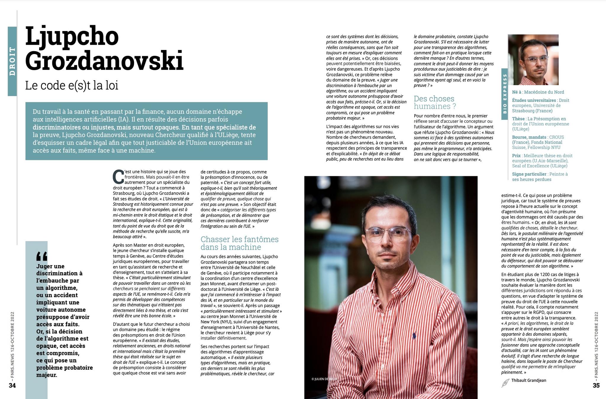 ➡ Du travail à la santé en passant par la finance, aucun domaine n’échappe aux intelligences artificielles (IA). Il en résulte des décisions parfois discriminatoires ou injustes, mais surtout opaques. En tant que spécialiste de la preuve, Ljupcho Grozdanovski tente d’esquisser un cadre légal afin que tout justiciable de l’Union européenne ait accès aux faits, même face à une machine.