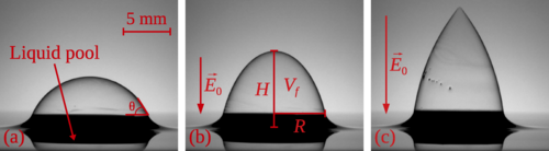 C'est d'ailleurs la présence de cette membrane, et donc de deux interfaces air-liquide, qui permet de distinguer les bulles des gouttes. En effet, ces dernières ne possèdent qu'une seule et unique interface, ce qui fait que le volume d’une goutte est entièrement composé de liquide, et est donc plus « lourd » que celui d’une bulle. De ce fait, les gouttes sont plus sensibles à la gravité et se déforment beaucoup plus sous ses effets que les bulles. « Il est toutefois possible de modifier la forme d'une bulle d'autres manières, comme par exemples avec des champs électriques, explique Sébastien Mawet, doctorant au GRASP (Unité de recherches CESAM/Faculté des Sciences) de l’ULiège et premier auteur de l’article publié dans Physical Review Fluids. En effet, une fois déposée sur un substrat pour faciliter son étude et baignée dans un champ électrique, la bulle initialement hémisphérique se déforme en une demi-ellipse et adopte la forme d'un demi-ballon de rugby. « Si l'on continue à augmenter le champ jusqu'à atteindre des valeurs de l'ordre de plusieurs kilovolts par millimètre, reprend Sébastien Mawet, la bulle change encore une fois de forme pour adopter celle d'un cône. Une fois dans cet état, la bulle se met à éjecter à très grande vitesse des gouttelettes chargées micrométriques depuis sa pointe. » Ce phénomène physique porte le nom de « cône de Taylor », en mémoire du premier chercheur à lui avoir donné une explication.