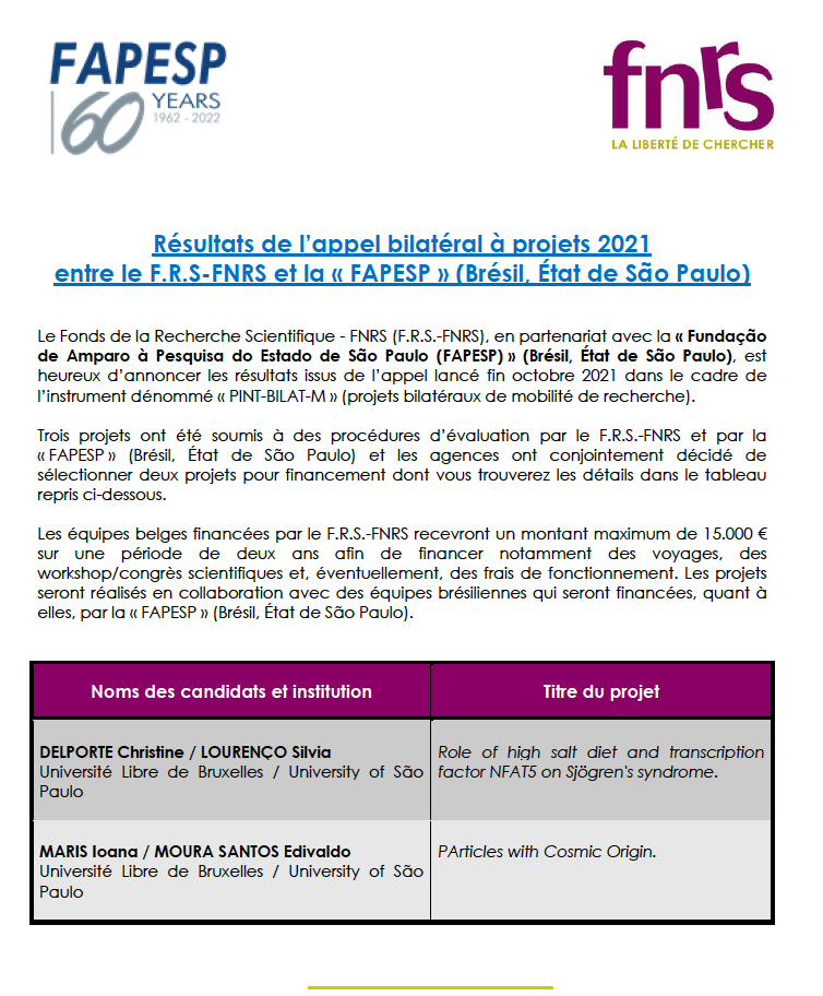 Résultats de l’appel bilatéral de mobilité avec la « FAPESP » 2021