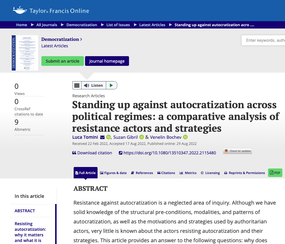 ➡ Luca Tomini, Chercheur qualifié FNRS ULB - Université libre de Bruxelles vient de signer un nouvel article dans tandonline.com où il apporte une réponse aux questions suivantes : pourquoi la résistance à l'autocratisation est-elle importante et pourquoi faut-il l'aborder ? Comment la définir ? Qui sont les acteurs impliqués et quelles sont les principales stratégies adoptées ?